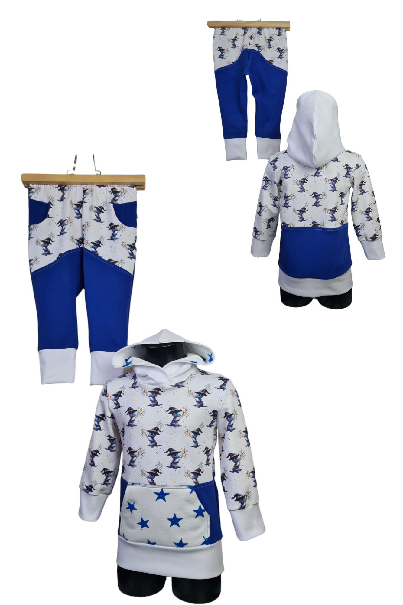 Hier habe ich ein Jogginganzug mit Blauer unterteilung gearbeitet. Der Hoodie hat vorne eine Tasche mit dem gleichen Stoff passend zur Mütze. Der Jogginganzug ist bequem und angenehm auf der Haut zu tragen..