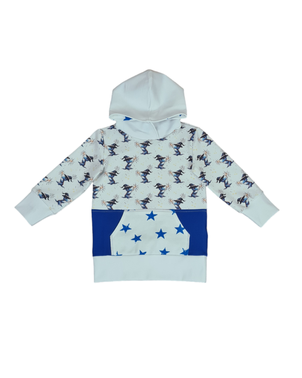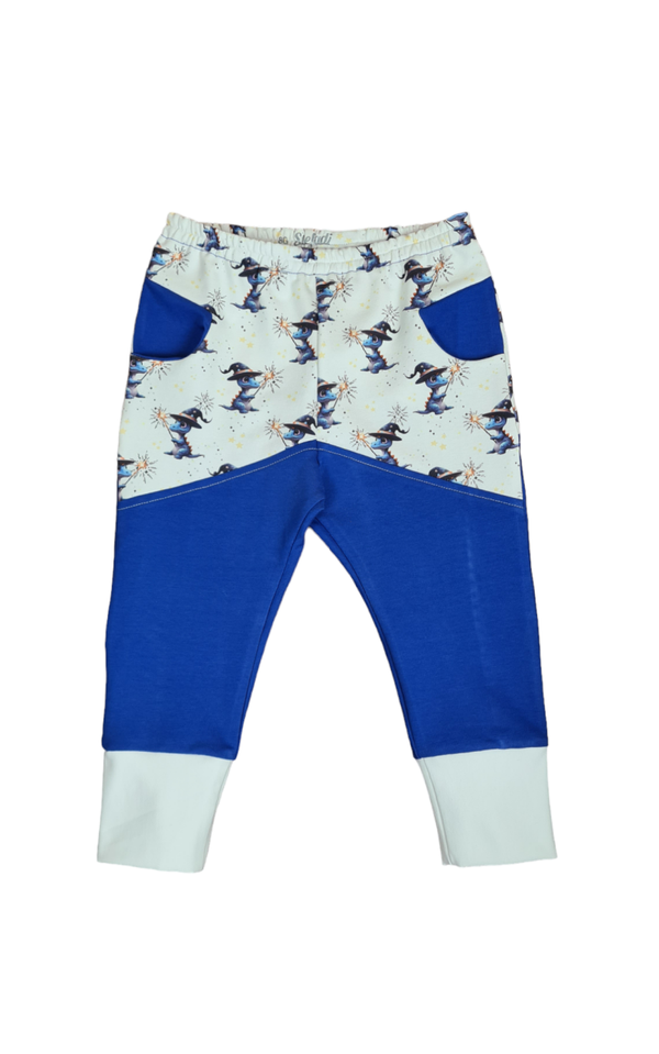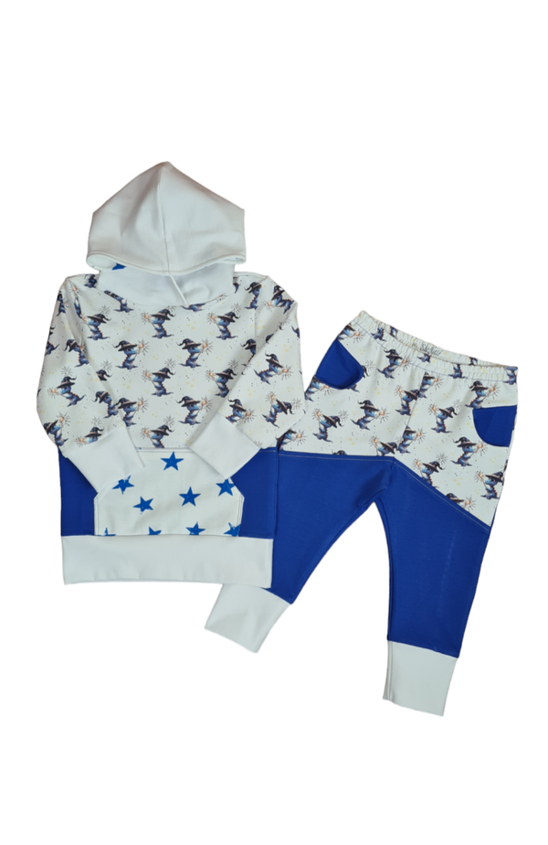 Die Hosentaschen wurde mit Blauen French Terry gearbeitet, die Mütze mit Weiß Sweatstoff mit Blauen Sternen.