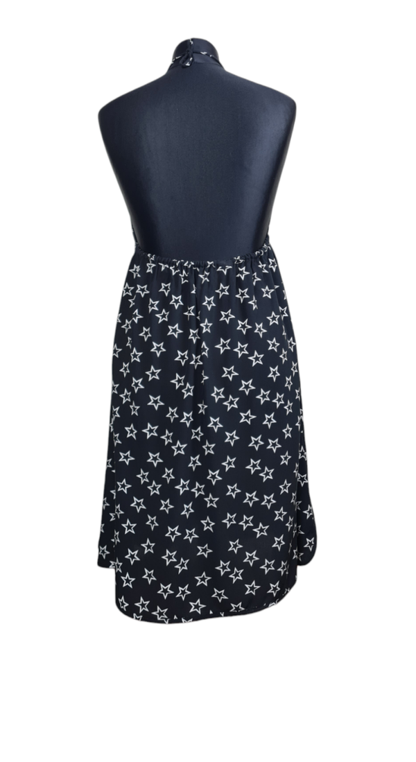 Sehr schönes Sommerkleid in schwarz mit Weißen Sternen, sehr angenehm kühlend auf der Haut. Leicht,Luftig und fließender Fall. Das Kleid wird oben zusammen gebunden wie der Bikini.