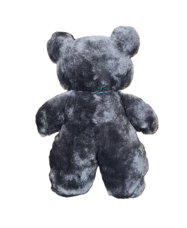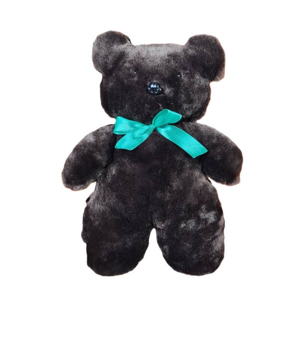 Um den Hals trägt der Teddybär ein Grünfarbenes Satinband als Schleife