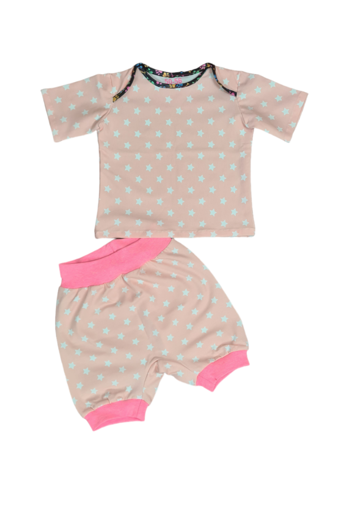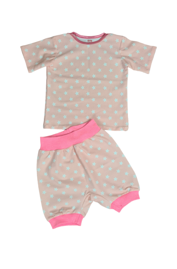 Hier habe ich aus Rosa Baumwolljersey mit Motiv Weiße Sterne, T-Shirts und Hose , das T-Shirt ist mit Amerikanischen Auschnitt genäht..