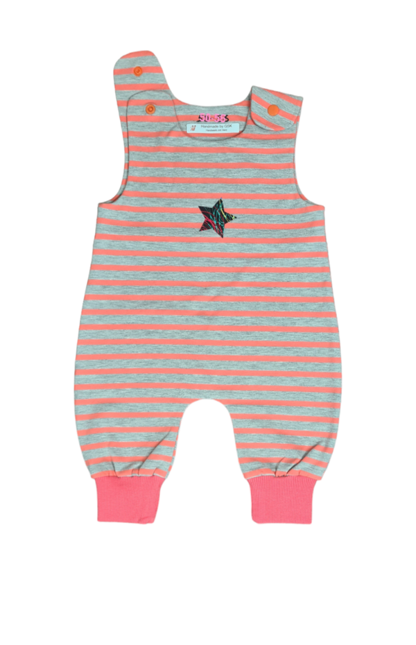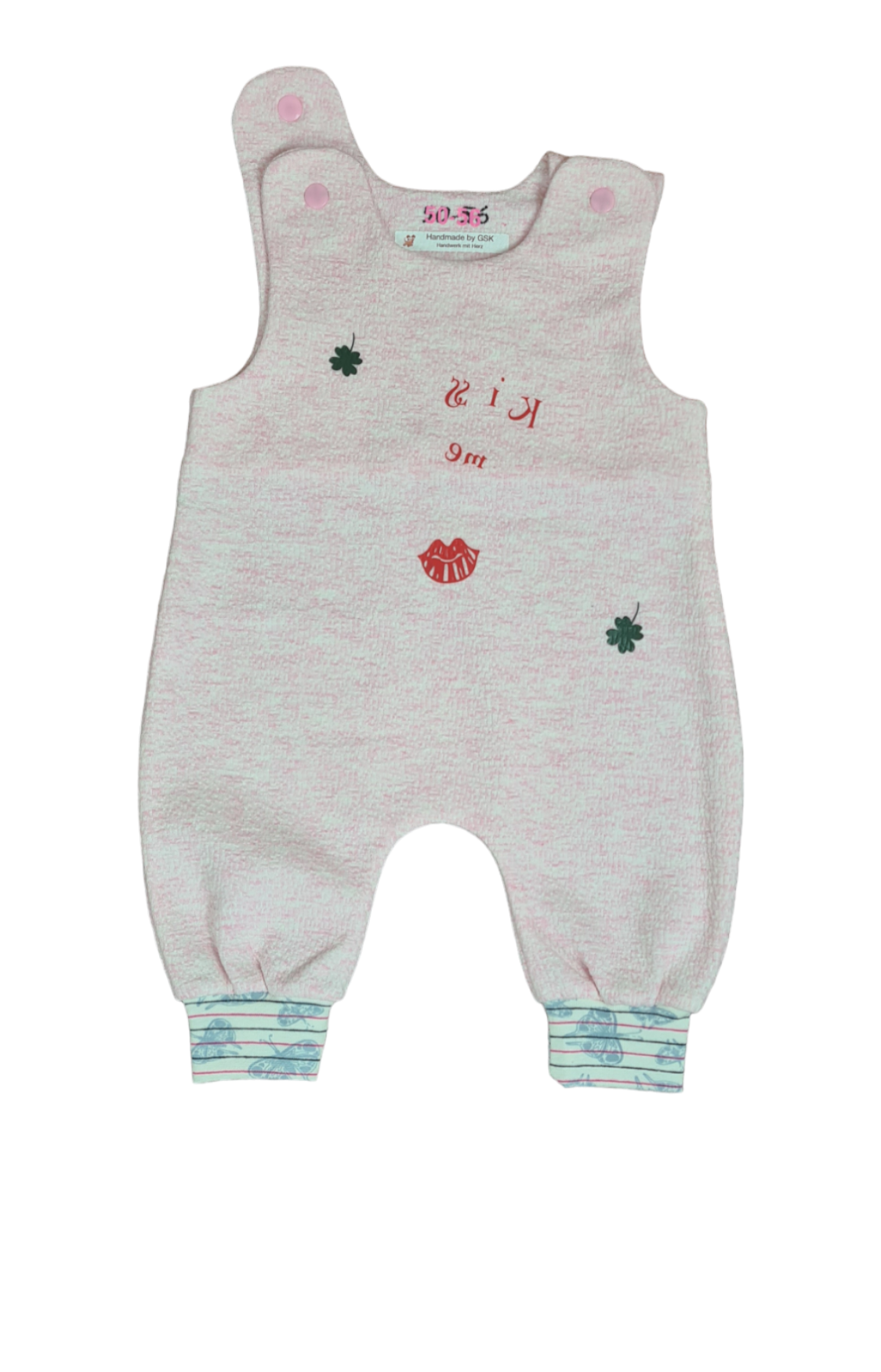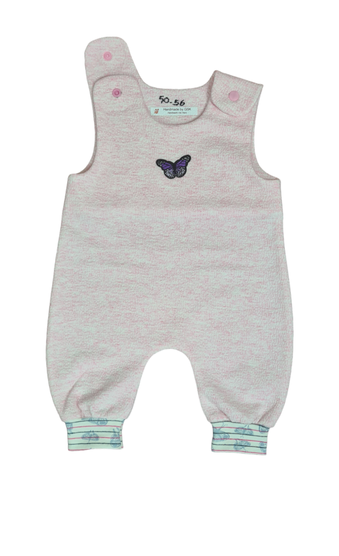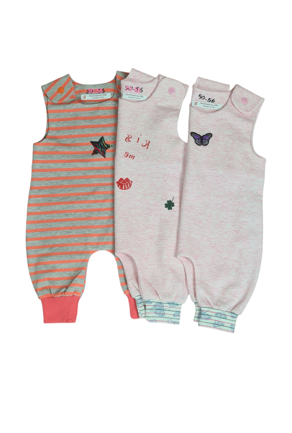 Der Strampler wird an den Schultern je mit einen Plastik Druckknopf geschlossen, der Saum ist mit Bündchen in verschiedenen Farben mit und ohne Motiv gearbeitet.