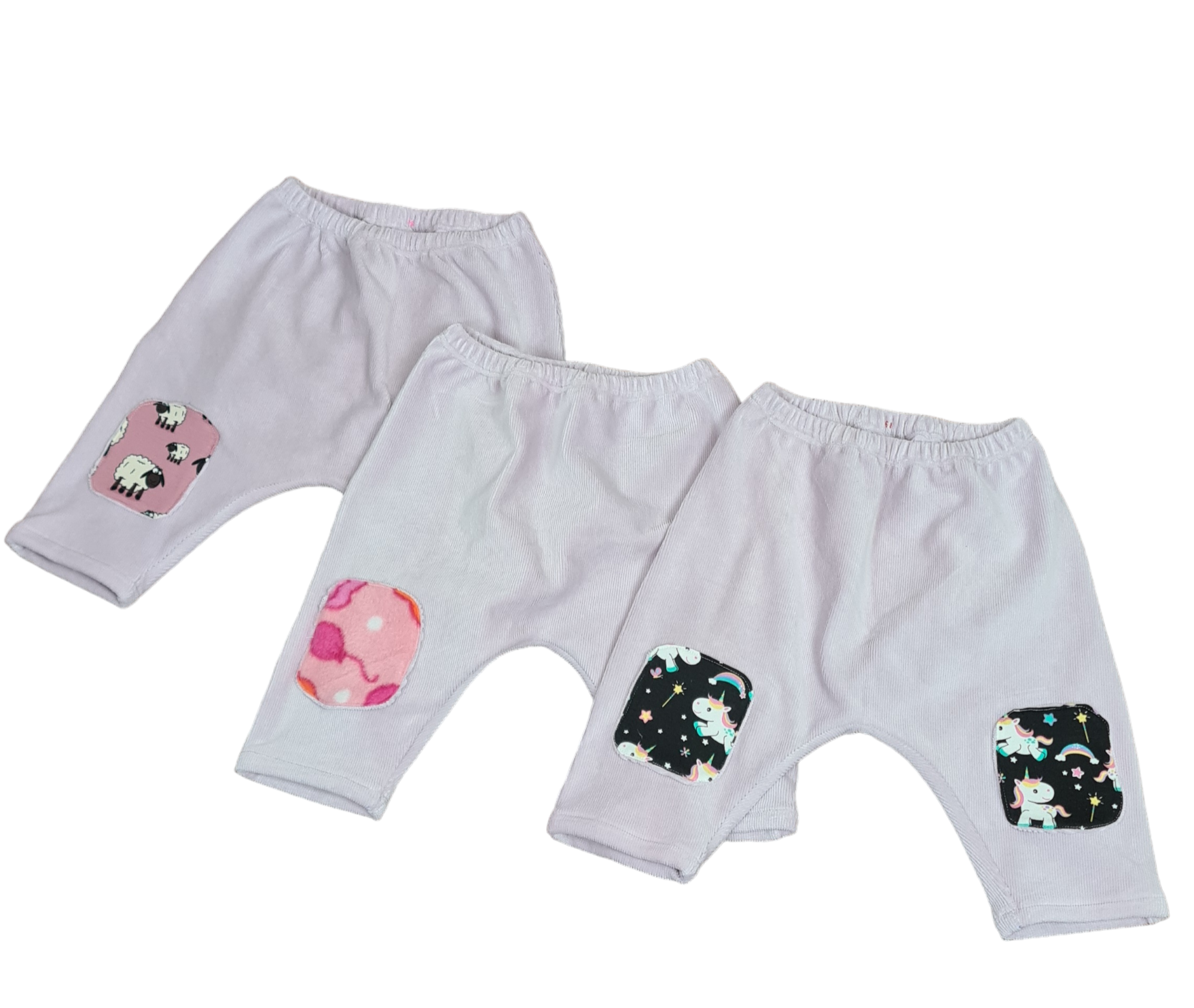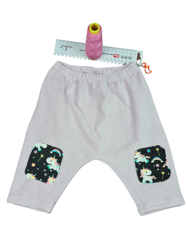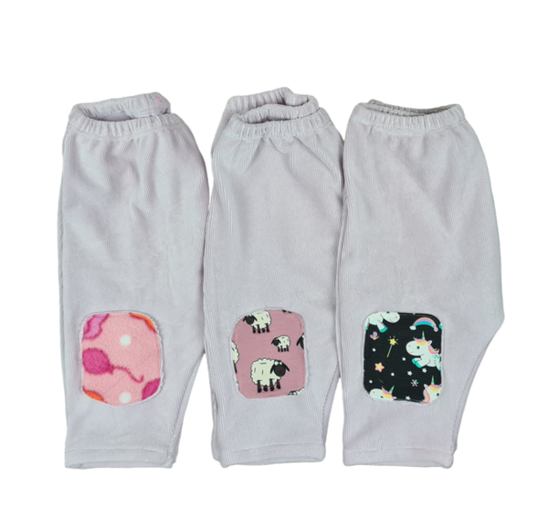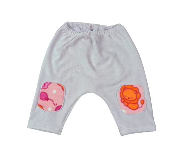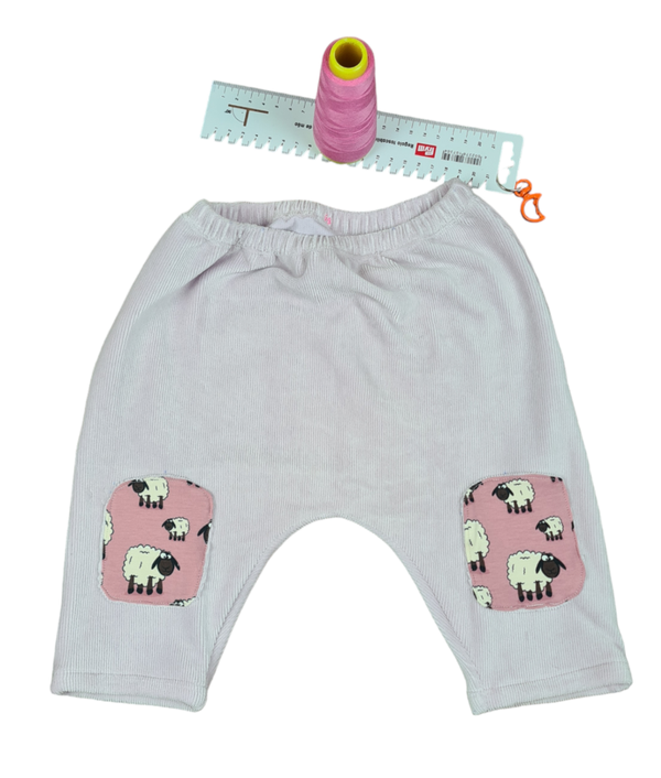 Hier habe ich elastisches Feincord in Hellflieder mit Flicken mit verschiedene Motive genäht.