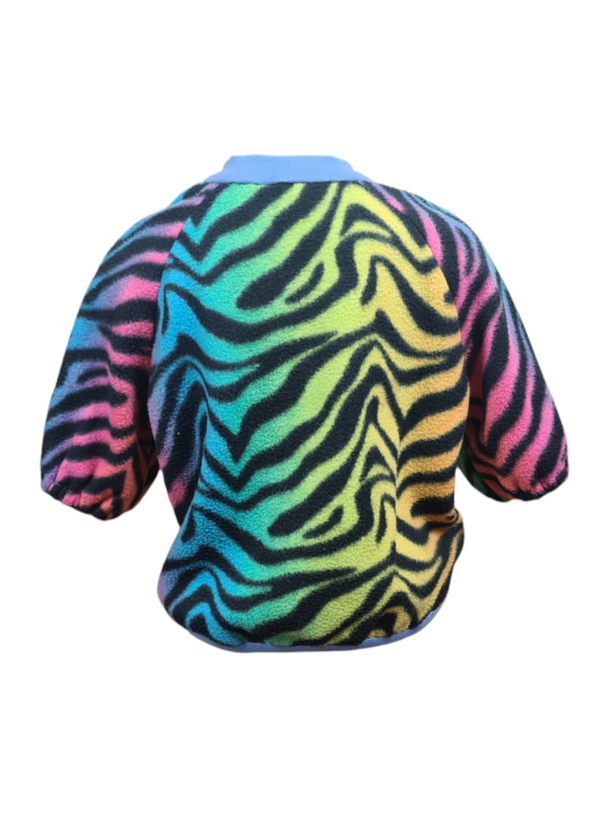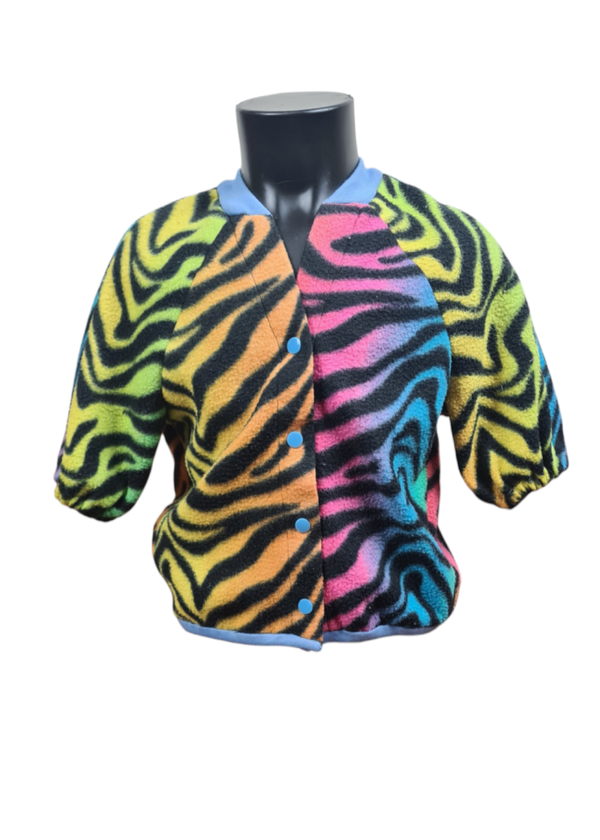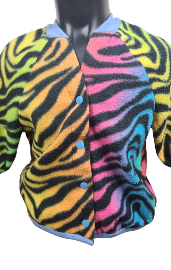 - Die Jacke ohne Mütze, am Hals Ausschnitt & Saum wurde mit Hellblauen Bündchen versäubert. Die Ärmel würde auf 1cm breit abgesteppt und 0,5 cm breites Gummiband eingenäht. Die Jacke wird mit verschieden Farbigen Plastik Druckknöpfen geschlossen.