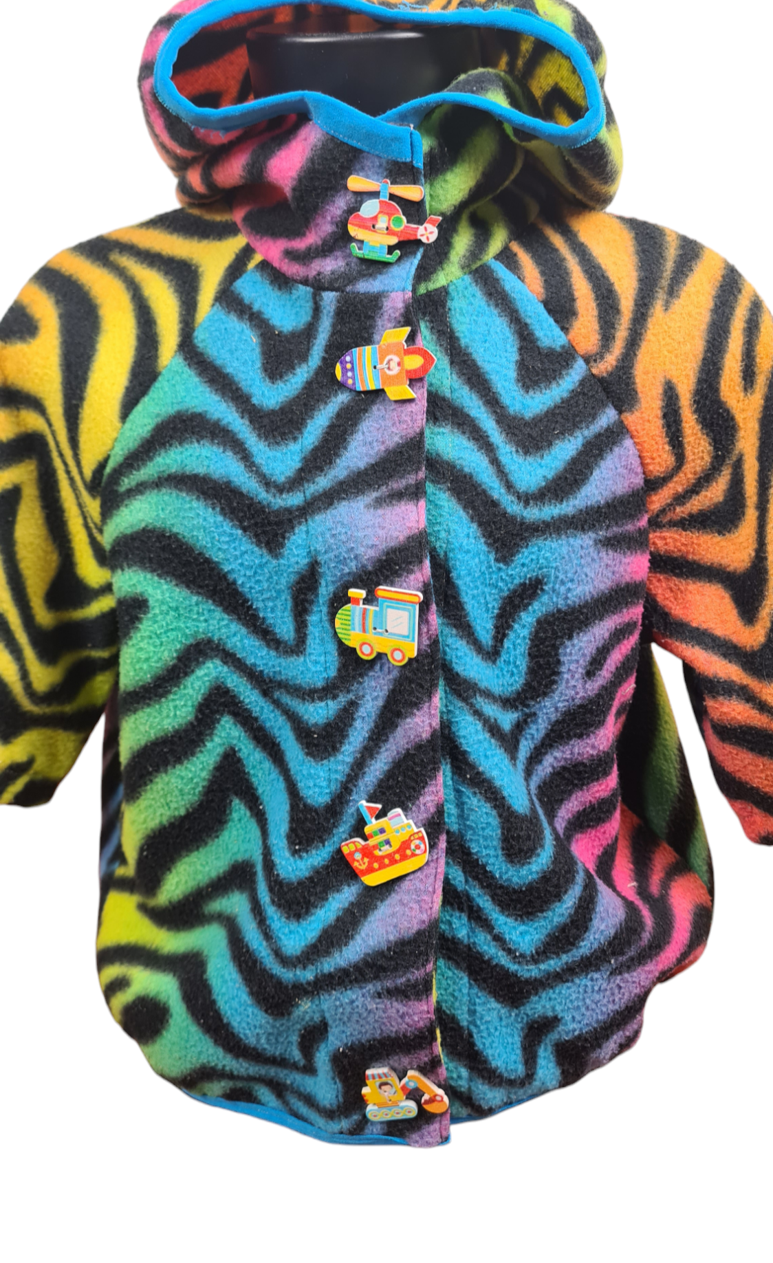 - Die Jacke mit Mütze, Mütze & Saum wurde mit Blauen elastik Schrägband versäubert.Ärmel wurden auf 1cm breit abgesteppt und 0,5 cm breites Gummiband eingenäht.Der Verschluss ist mit Klett, auf der außenseite mit Holzknöpfe Form Autos verziert.