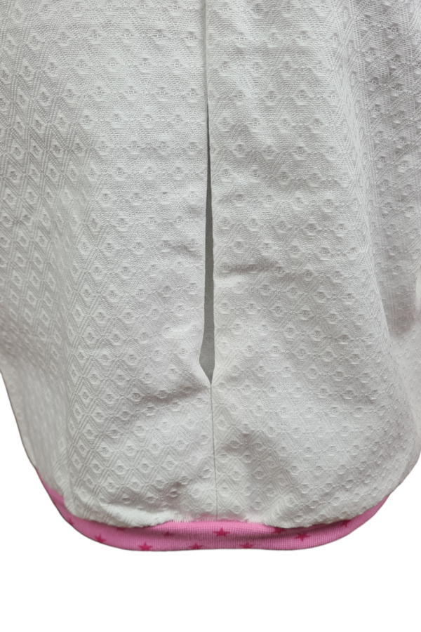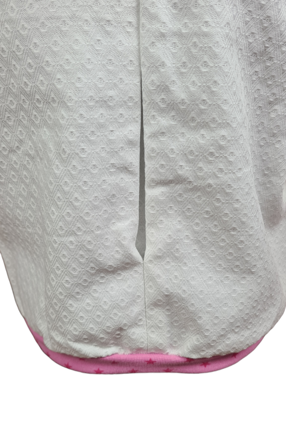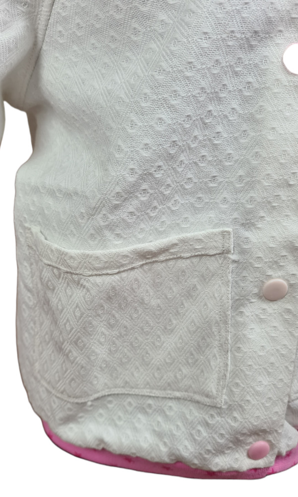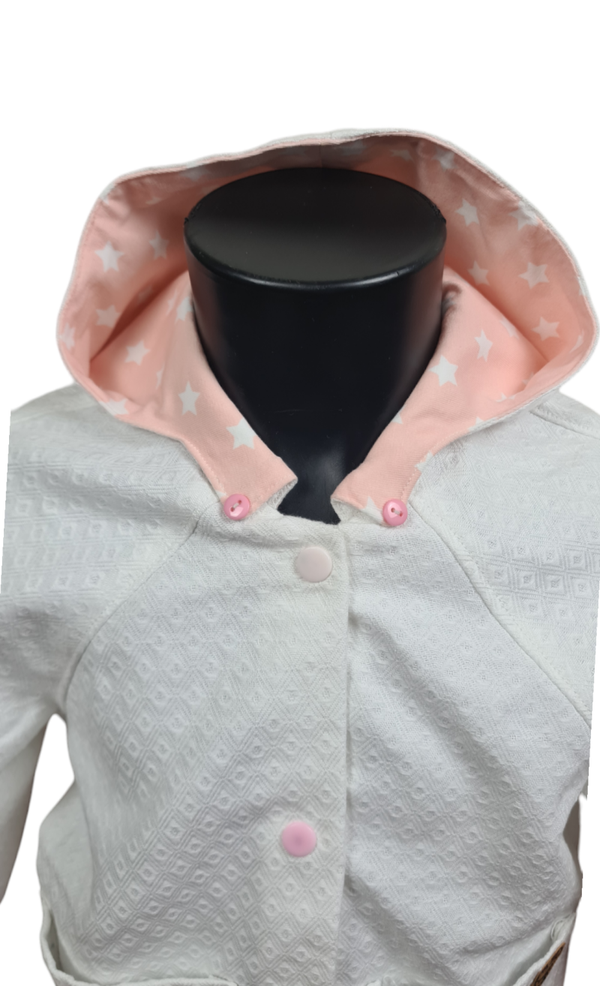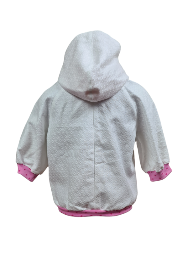 Sommer Jäckchen aus Weißer Baumwolle Motiv Raute eingewebt, Mütze ist mit Rosa Baumwolljersey Motiv Weiße Sterne abgefüttert. Die Jacke hat vorne eine aufgesetzte Tasche, Ärmel & Saum sind mit Pinken Bündchen Motiv Pinke Sterne. Verschlus sind 4 Rosa Plastik Druckknöpfe.