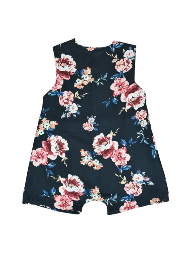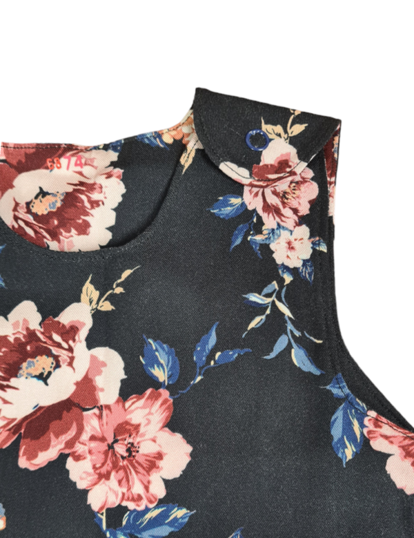 Sommer Jumper luftig, leicht in Marineblauer Viskose Motiv Blumen. Der Jumper wird an den Trägern über 1 paar Jersey Druckknopf in Dunkelblau geschlossen.
