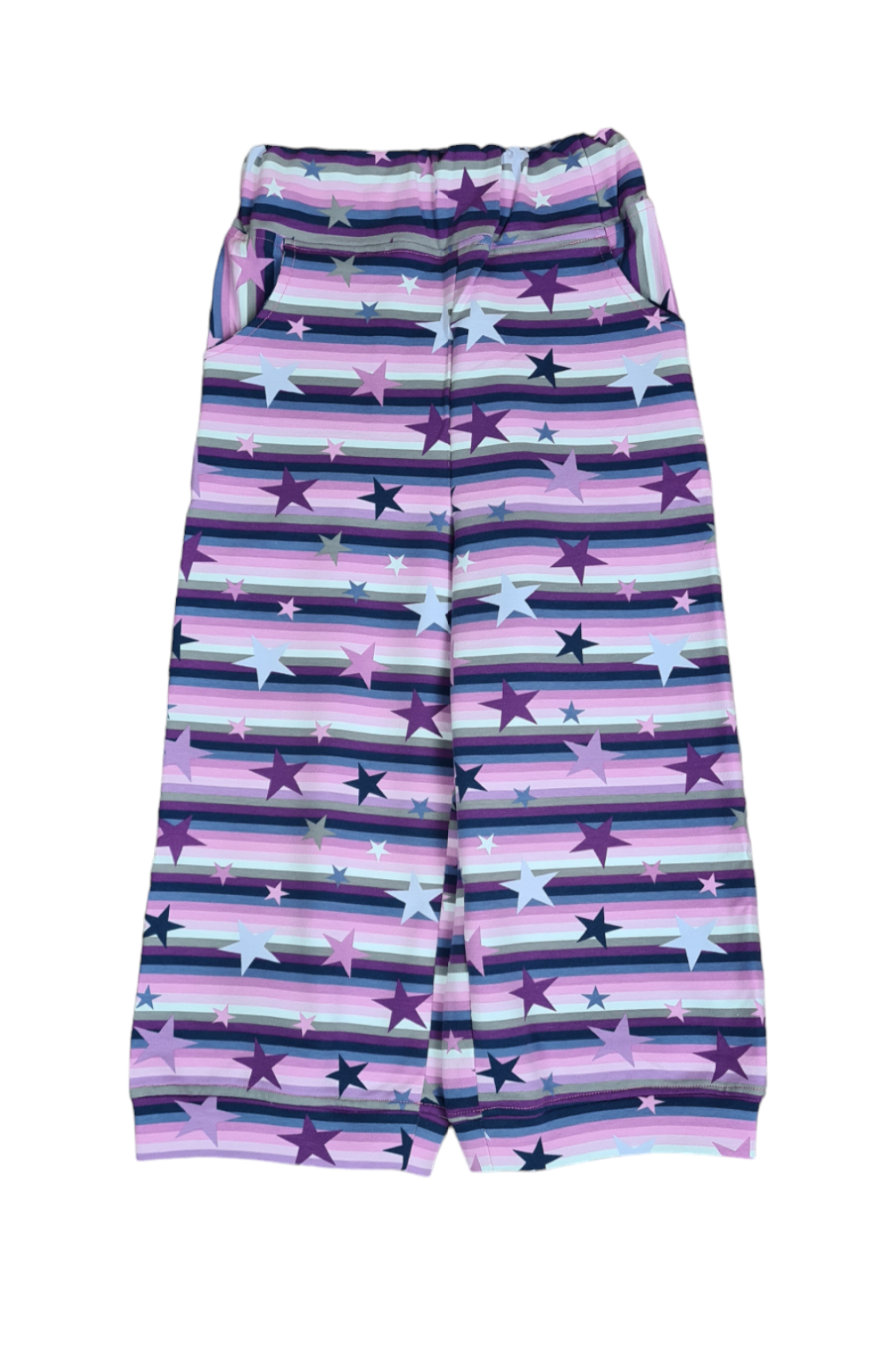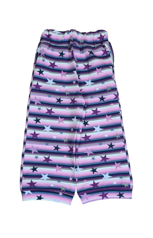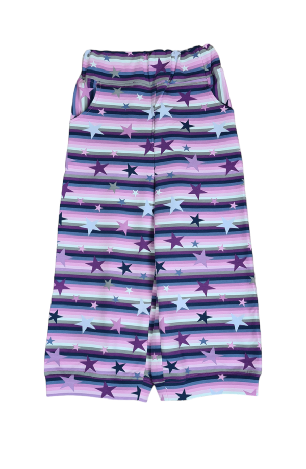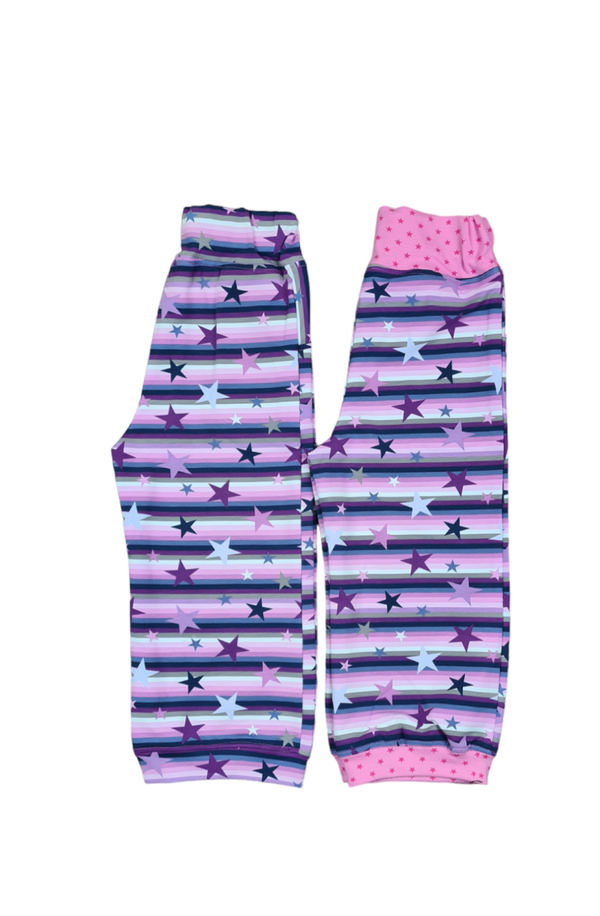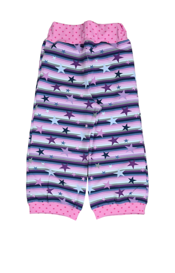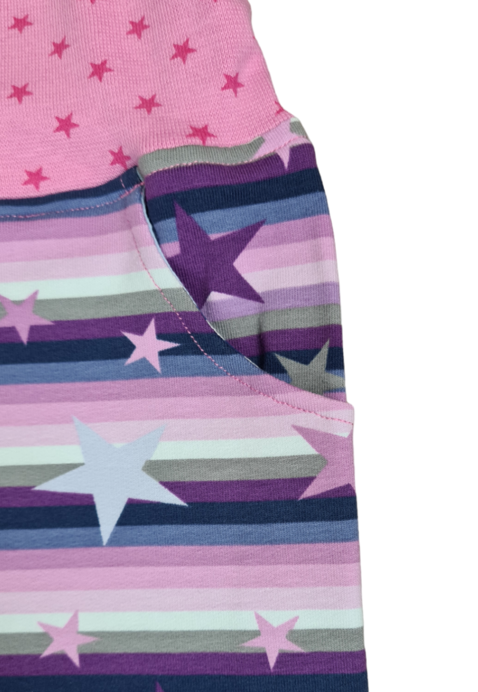 Sehr bequeme Jogginghose mit weiten Bein.Hier wurde Lila French Terry Motiv gestreifte mit Sterne und angesetzten Bündchen genäht.Im Bund habe ich für noch besseren halt einen 4 cm breiten Gummi eingearbeitet.Die Hose hat eine kleine Hosentasche....