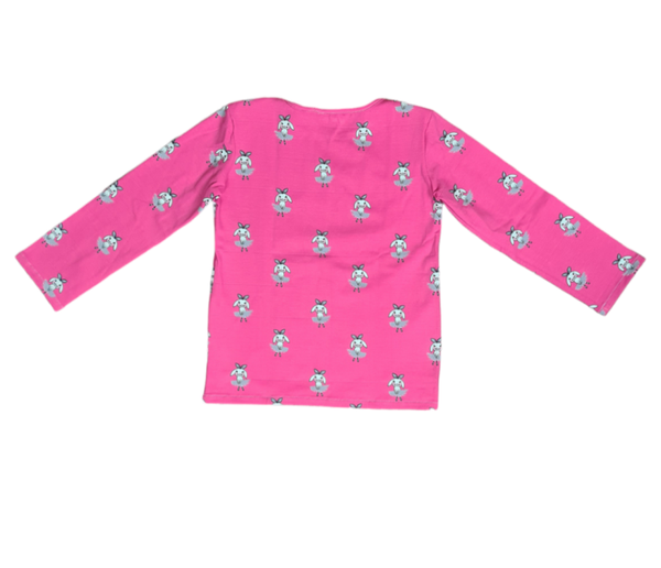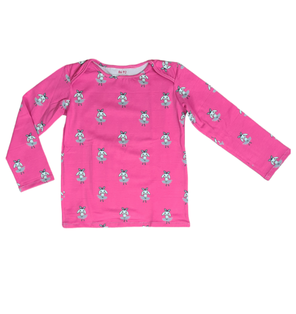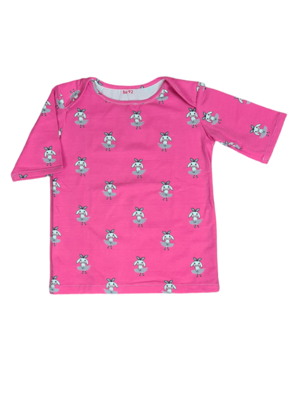 Hier habe ich aus einem Rest weichen Baumwolljersey in Pink Motiv Hasenballerina Dünnen Pullover & T-Shirt mit amerikanischen Ausschnitt genäht. Der Ausschnitt ist mit Schrägstreifen aus den gleiche Stoff gearbeitet.Ärmel auf 1cm & Saum 1,5 cm breite abgesteppt.
