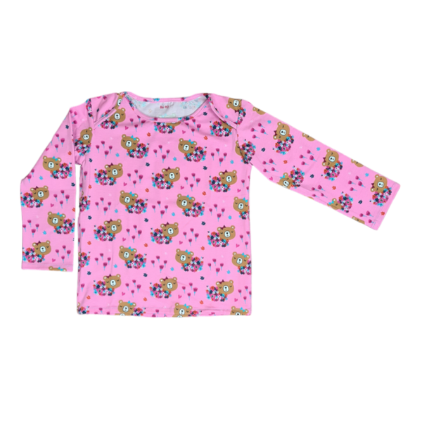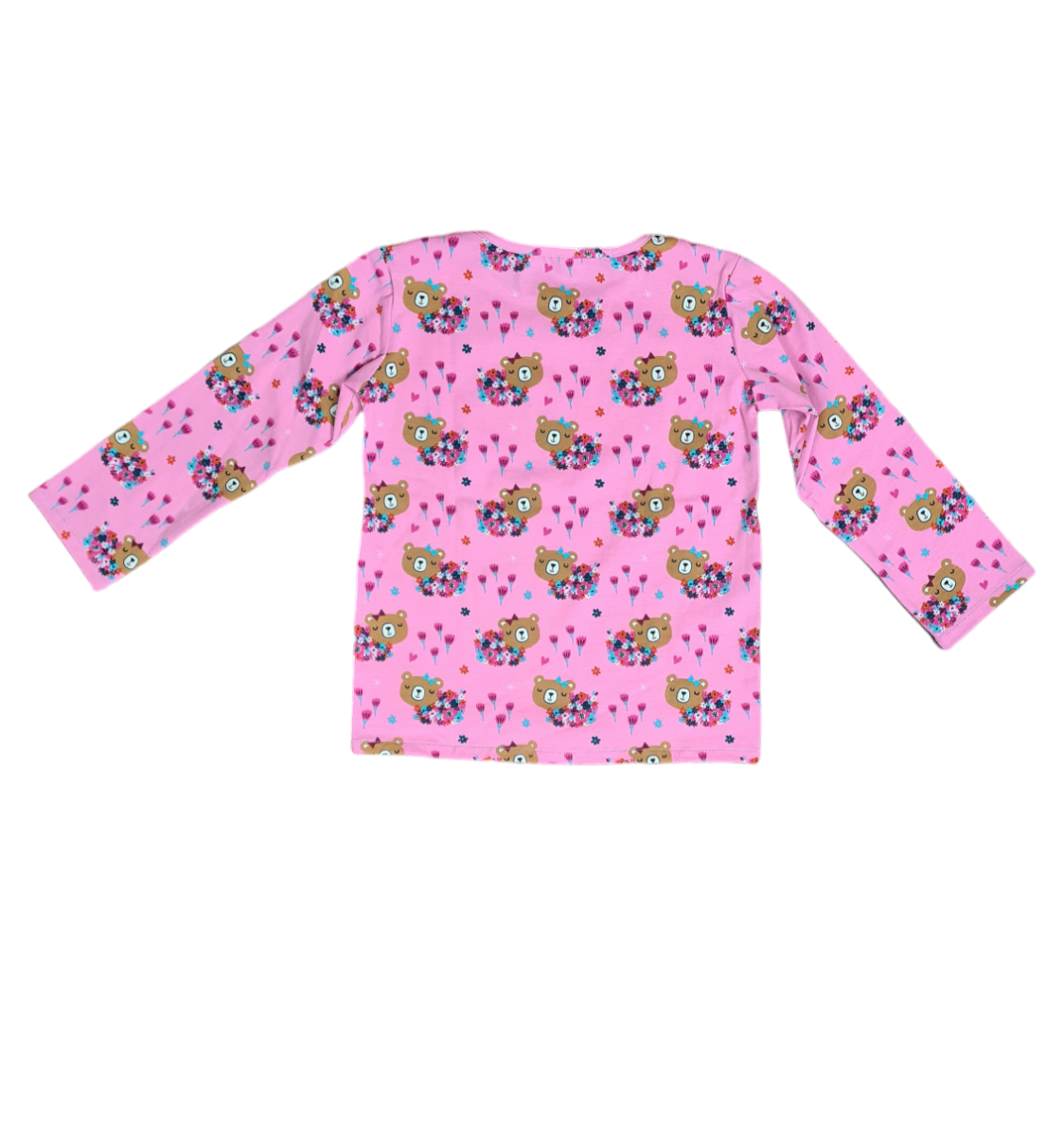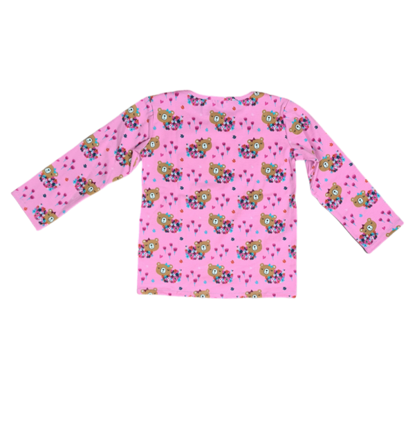 Hier habe ich aus weichen Baumwolljersey in Rosa Motiv Blumenbär, Dünnen Pullover & T-Shirt mit amerikanischen Ausschnitt genäht. Der Ausschnitt ist mit Schrägstreifen aus den gleiche Stoff gearbeitet.Ärmel auf 1cm & Saum 1,5 cm breite abgesteppt.