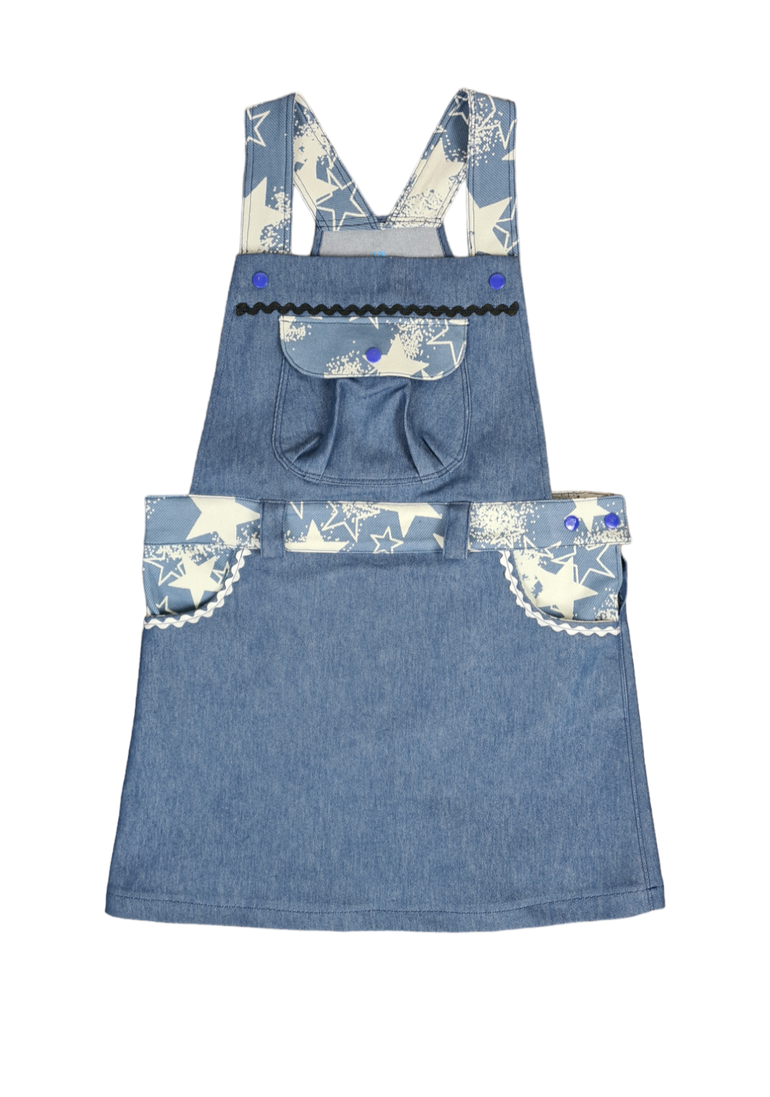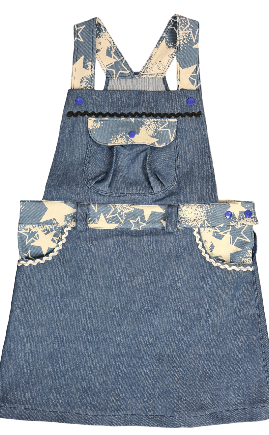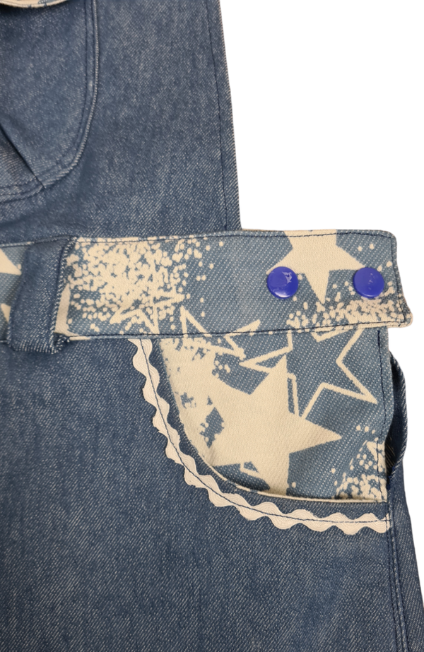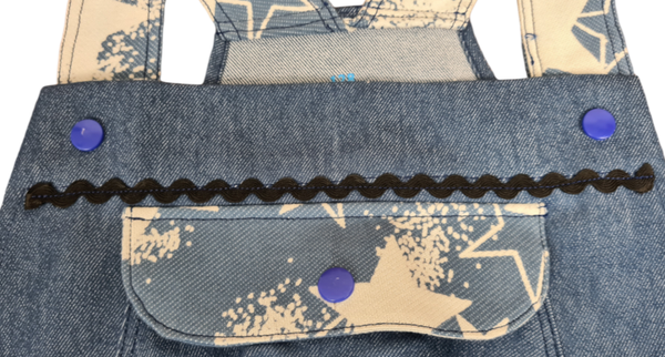 Bund .- Taschen Innenseite .- Taschenklappe & Träger sind aus Jeans Jaquard Stretch Maxi Sterne Cash Hellblau..Der Hauptstoff ist aus Jeans grob Uni Jeansblau.