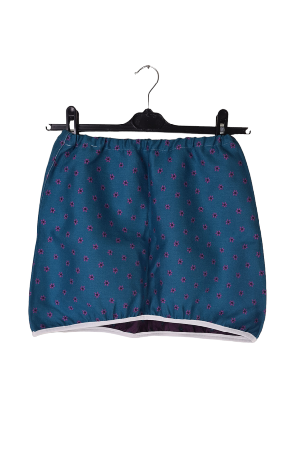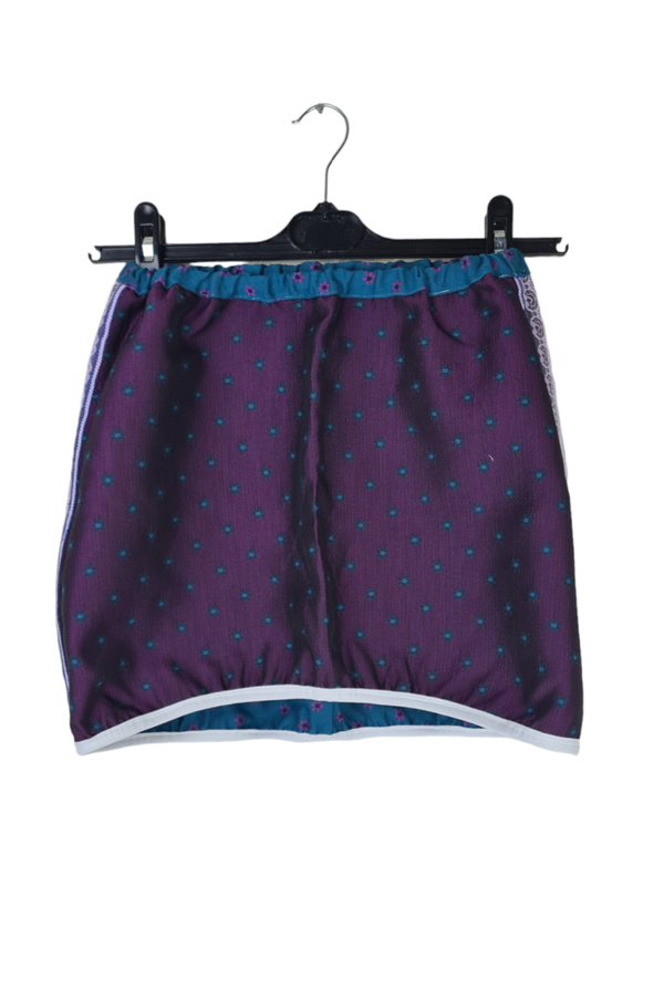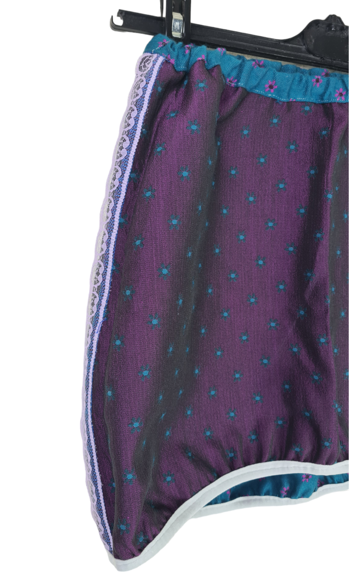 Der Rock ist leicht abgerundet und hinten länger als vorne. Die Lila Seite hat an den Seitren nähte eine Fliederfarbige Spitze aufgenäht bekommen. Der Saum ist mit Weißes Elastikband abgenäht worden.