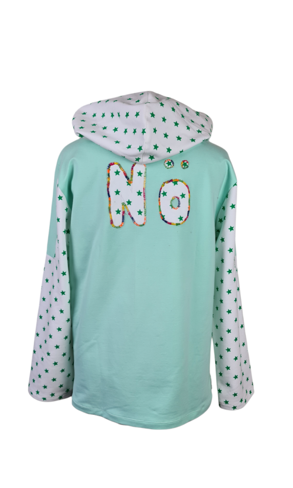 Der Hoodie hat hinten eine Applikation " NÖ " die mit Bunten Faden per Hand aufgenäht wurde.