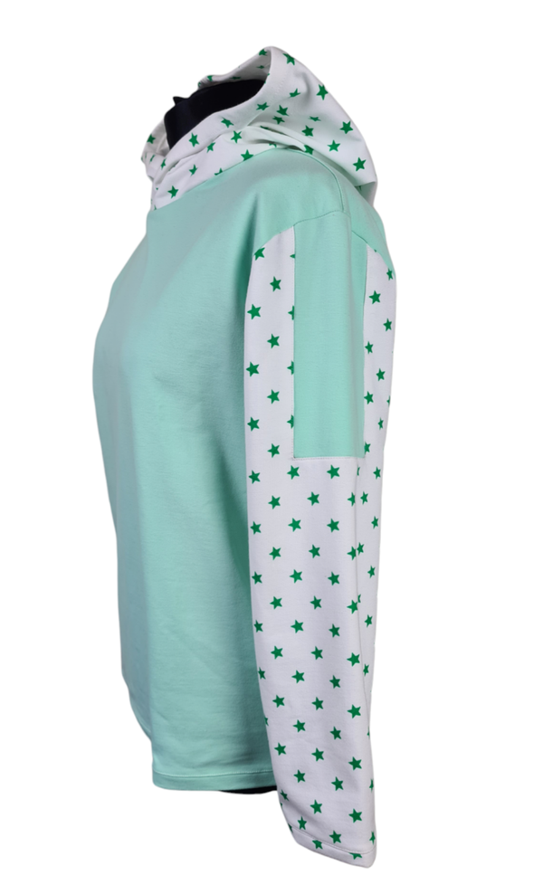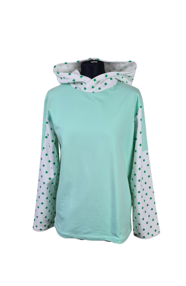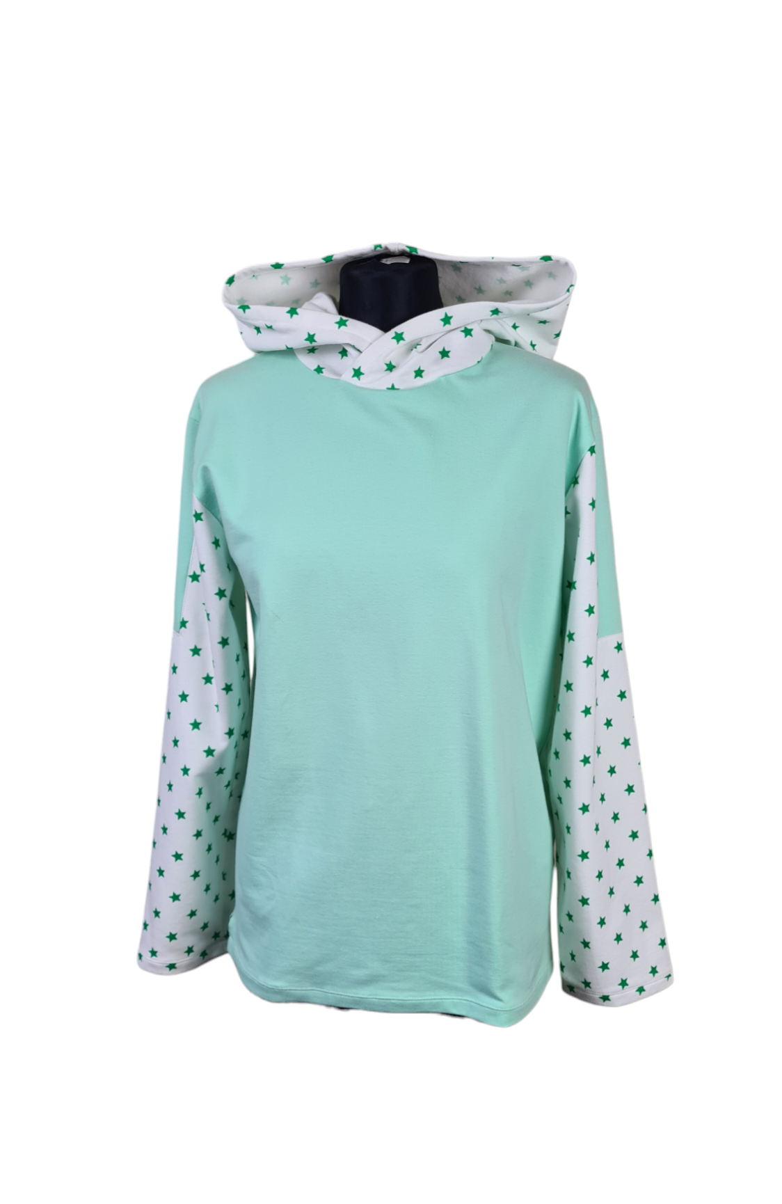 Hier habe ich ein Hoodies für die kalten Tage genäht. Verarbeitet wurden Sweatstoff und French Terry . Der Sweatstoff ist innen angeraut und schön kuschelig weich. Der Hellmint Uni ist ein French Terry und der Weiße mit Sterne ist ein Sweat Stoff.
