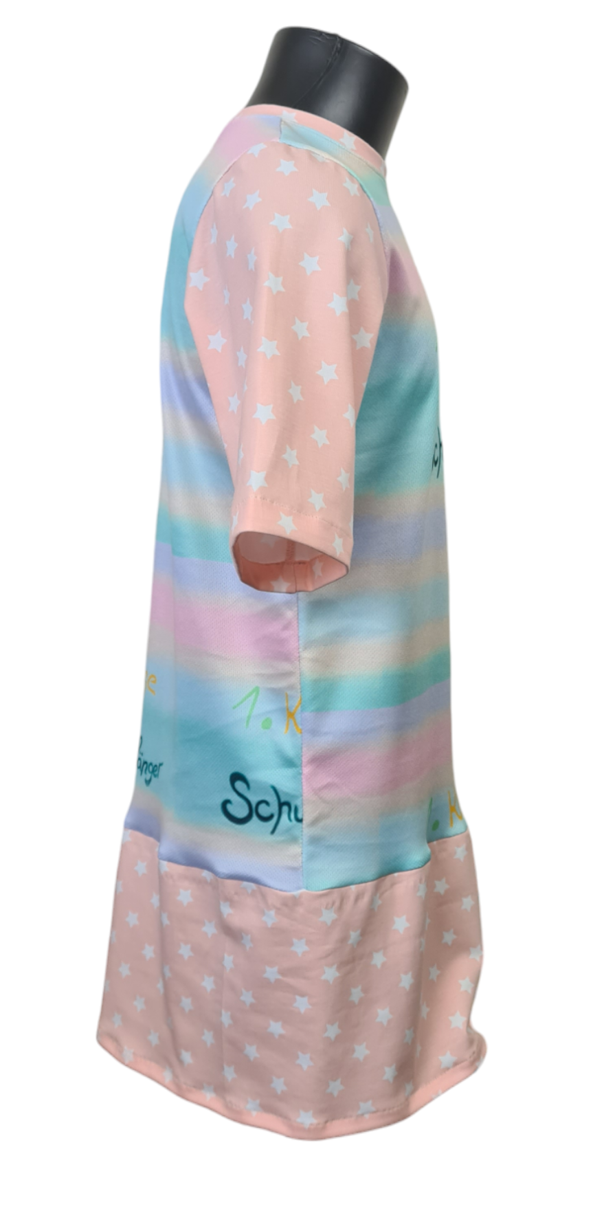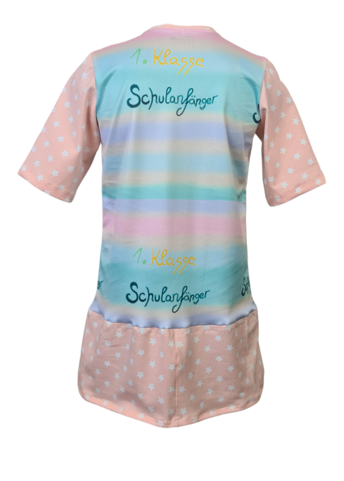 Der Hauptstoff ist Sportjersey Material 100% PES , Farbe gestreift Bunt Aufschrift " 1. Klasse Schulanfänger "