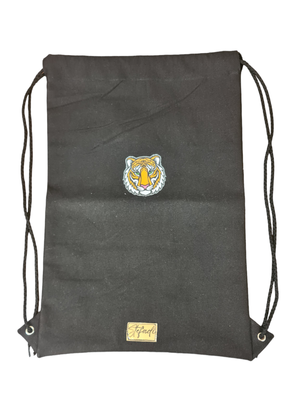 Hier habe ich aus schwarzen Canvas einen Rucksack, - Turnbeutel genäht der auf der Vorderseite ein Tiger Bügelbild aufgebügelt bekommen hat.