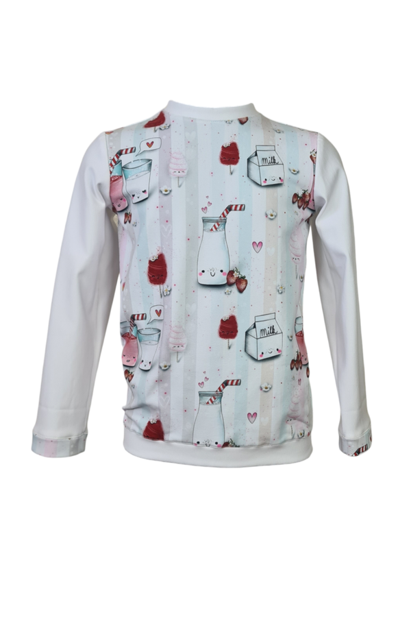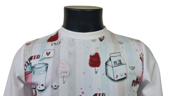 Hier habe ich ein Pullover genäht aus French Terry mit dem Design von * Makeart.Berlin* Erdbeertraum bunt Pastell gestreift,Vorder und Rückseite und Halsausschnitt und Bund aus Weißen Uni Stoff. Die Ärmel sind aus Weißen Uni Stoff genäht und der Ärmel Saum aus Hauptstoff Erdbeertraum.