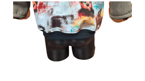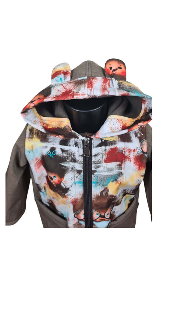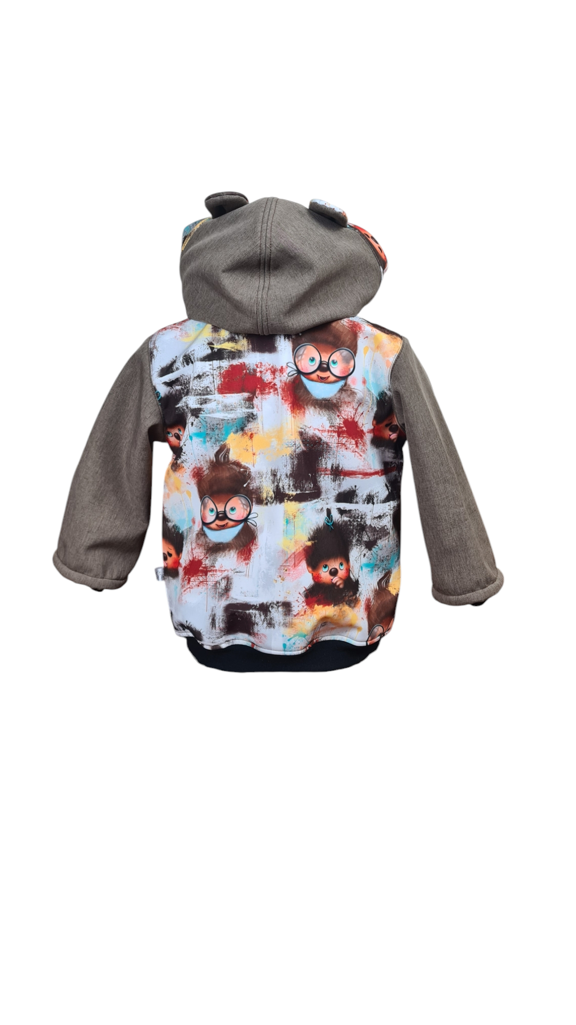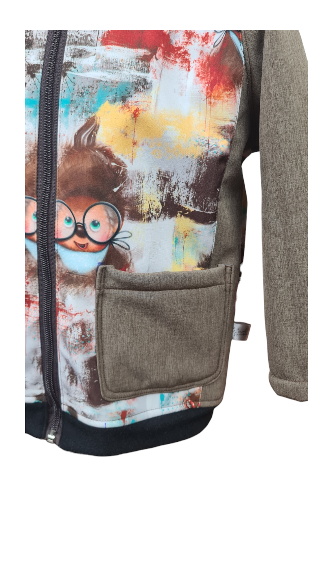Die Kapuze zieren zwei Teddyohren aus dem Motivstoff, während die aufgesetzten Taschen aus einfarbigem braunen Softshell bestehen.