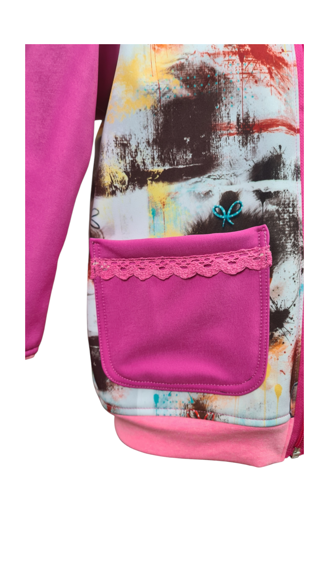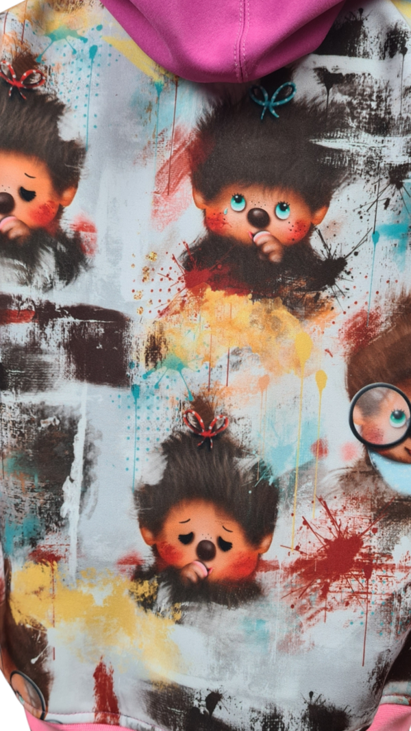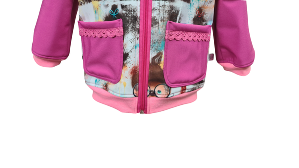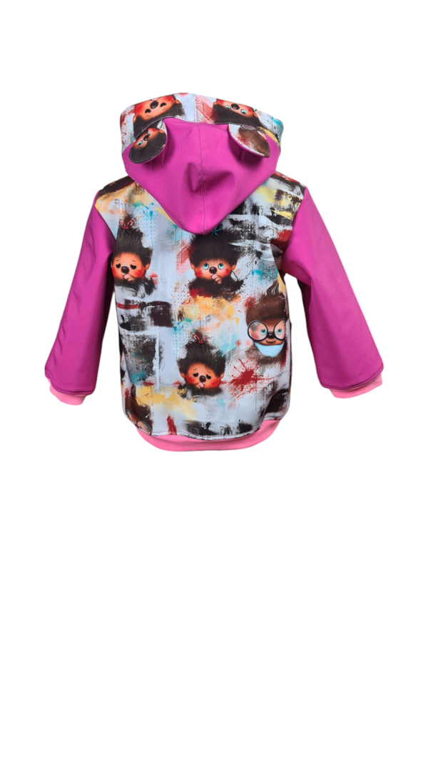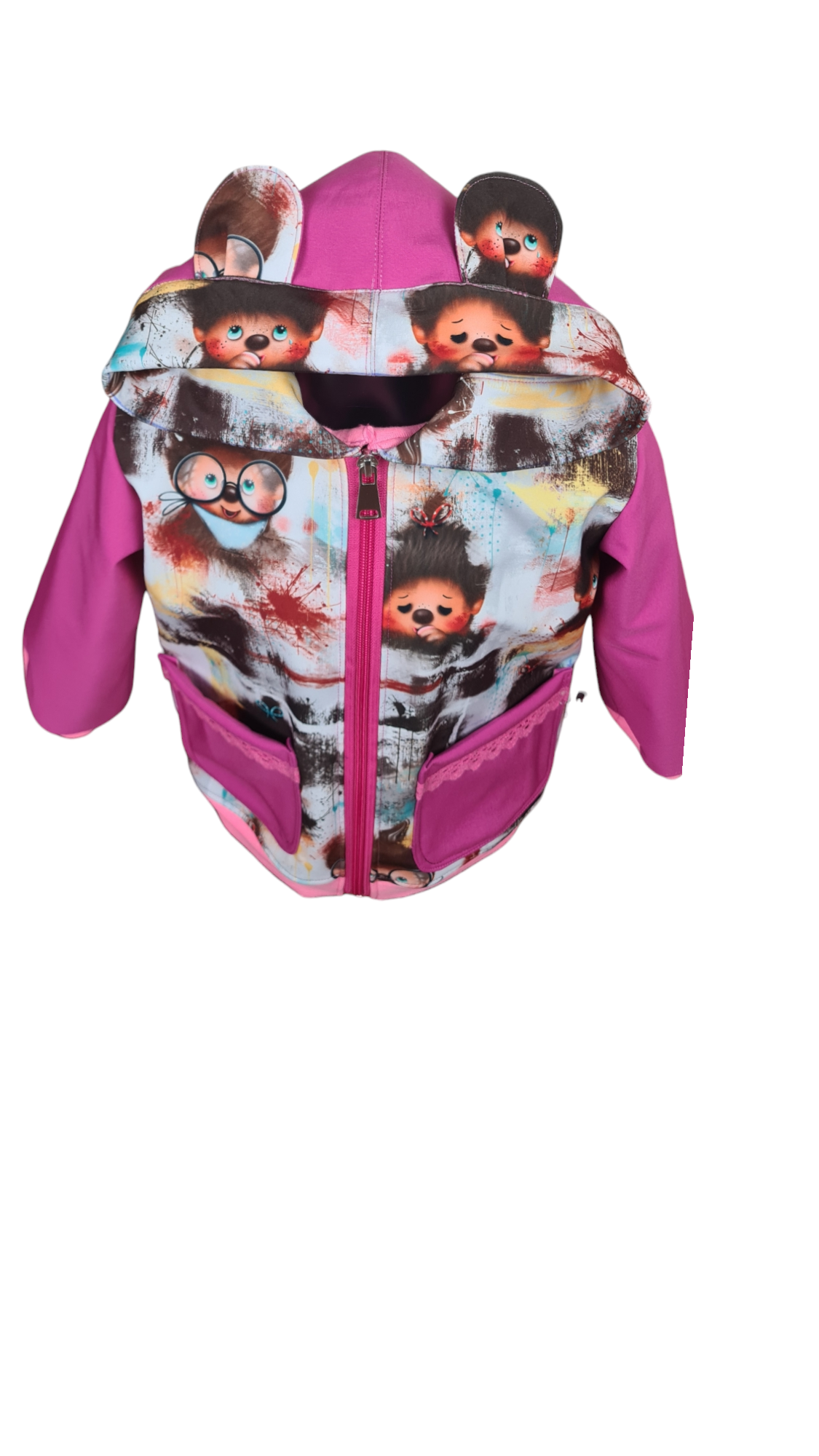 Die Kapuze zieren zwei Teddyohren aus dem Motivstoff, während die aufgesetzten Taschen aus einfarbigem Pinken Softshell mit aufgenähter Borte in Pink.