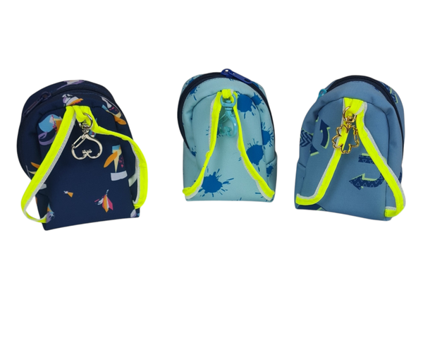 Hier habe ich verschiedene Minirucksäcke aus Softshell gearbeitet ohne Futter. Die Minirucksäcke habe hinten als Träger Reflektierband eigenäht. Der Schlüsselanhänger ist aus Metall in verschiedenen Farben und Formen näheres dazu unter Variante.