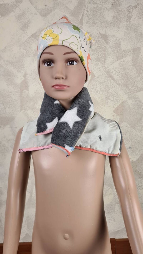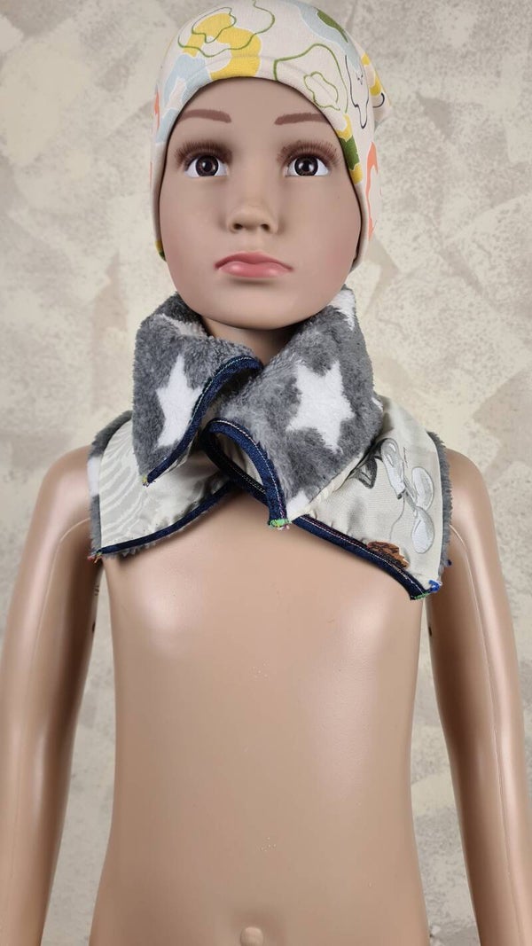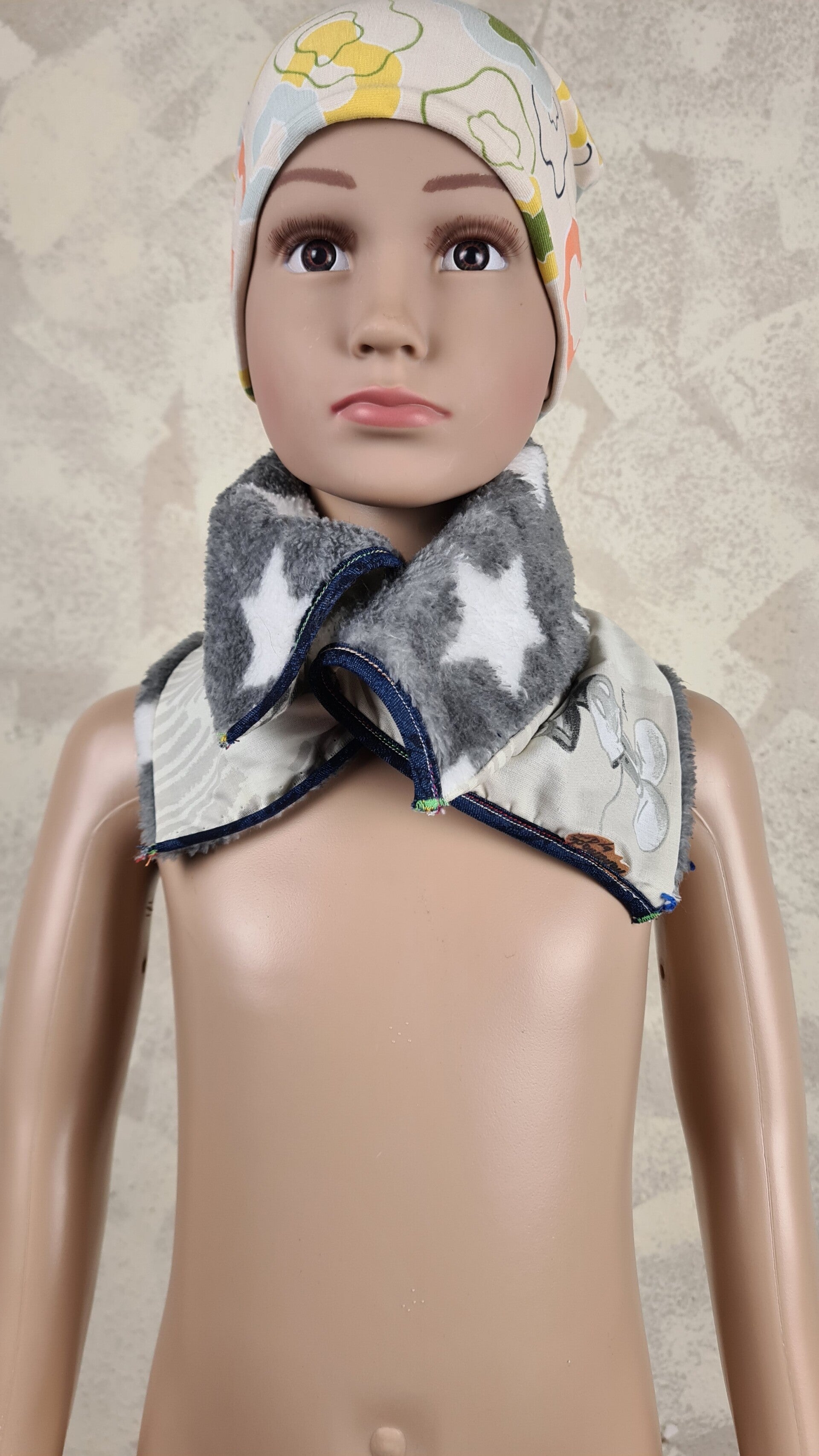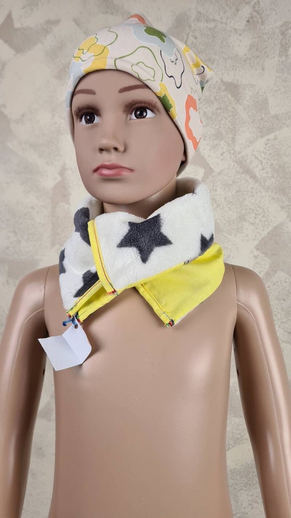 - Janosch 3 : Upcycling - 1 Gelber Jersey Druckknopf, die Enden sind aus Hellgrauen Jerseyschrägstreifen Motiv Scharfe versäubert, Außenseite Gelbe Baumwolle Motiv Janosch, Innenseite Weißer Fleece Motive Graue Sterne, ca. 54cm Lang und 19cm Breit