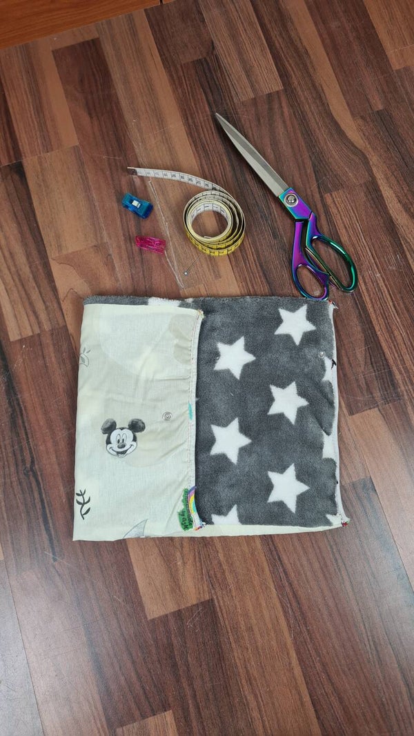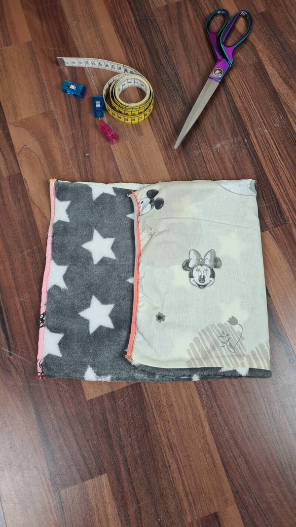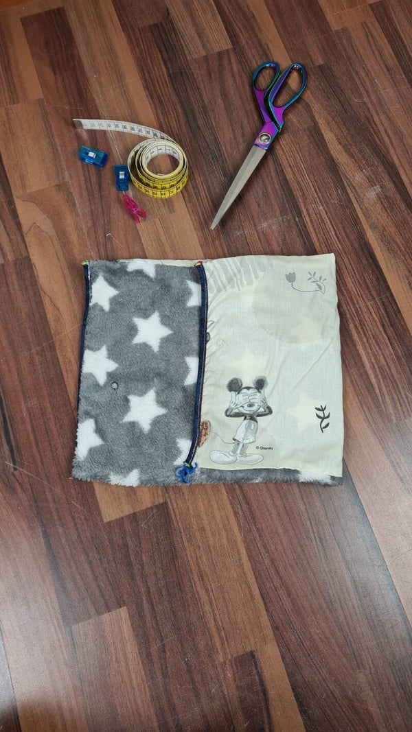 - Mini & Micky 1 : Upcycling -1 Beige Jesey Druckknopf, die Enden sind mit Jeansblauer Jersey-Schrägstreifen Motiv Blumen versäubert, Außenseite Beige Baumwolle Motiv Micky Maus & Mini Maus, Innenseite Dunkelgrauer Fleece Motiv Weiße Sterne, ca. 46,50cm Lang und 25cm Breit