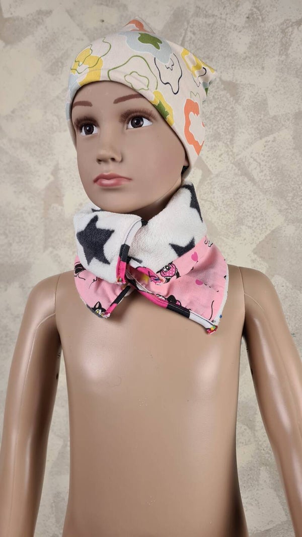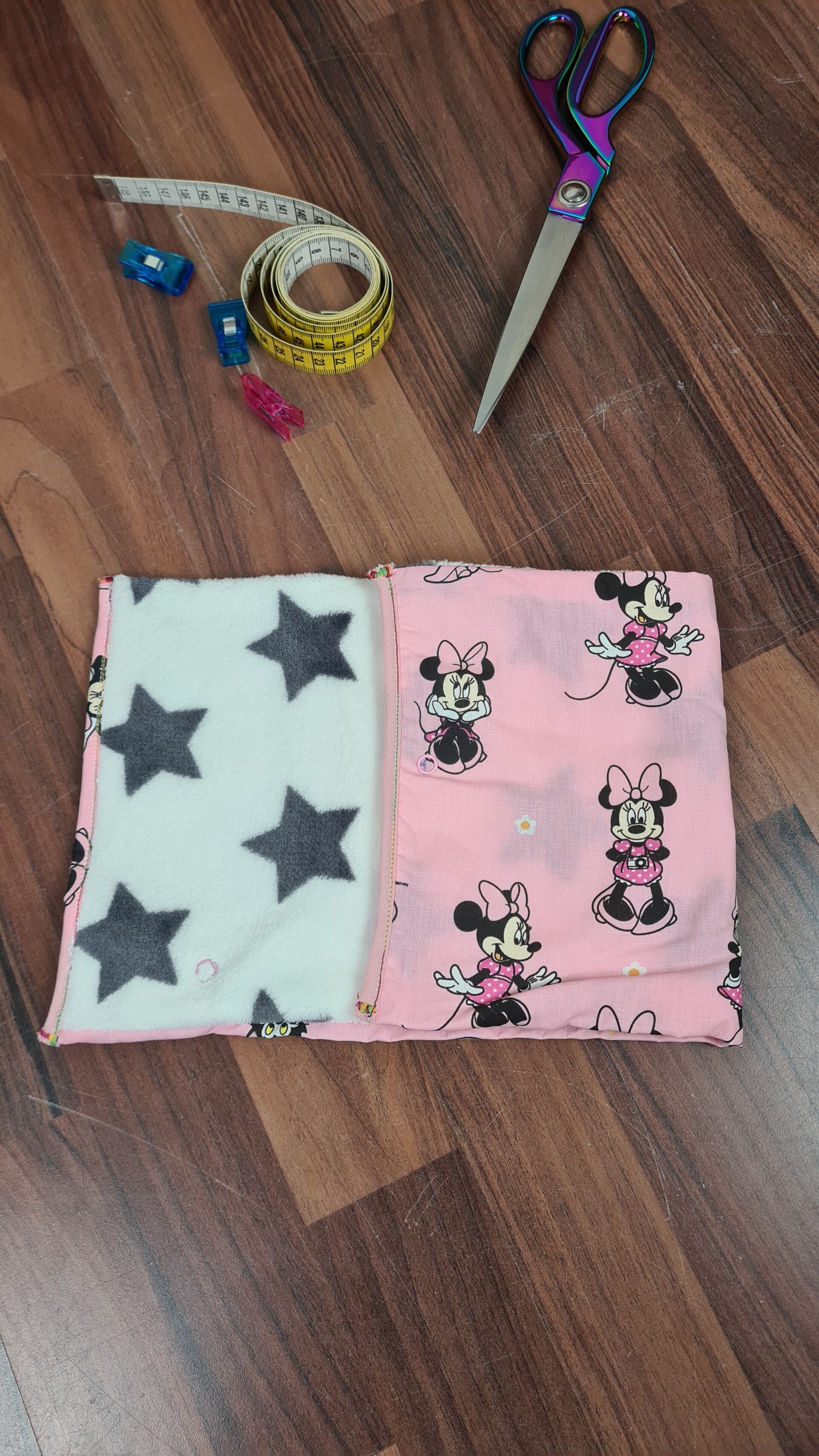 - Mini Maus 2 : Upcycling - 1 Rosa Jersey Druckknopf, die Enden sind 1x aus Rosa Baumwollschrägstreifen Motiv Uni und 1x aus Rosa Baumwollschrägstreifen Motiv Mini Maus versäubert, Außenseite Rosa Baumwolle Motiv Mini Maus, Innenseite Weißer Fleece Motiv Graue Sterne, ca. 44cm Lang und 20,50cm Breit