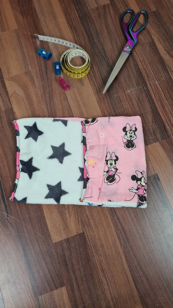 - Mini Maus 3 : Upcycling - 1 Rosa Jersey Druckknopf, eine Seite wurde mit Weißen Jerseyschrägstreifen Motiv Pink Mini Maus versäubert, Außenseite Rosa Baumwolle Motiv Mini Maus, Innenseite Weißer Fleece Motiv Graue Sterne, ca. 72cm Lang und 22cm Breit