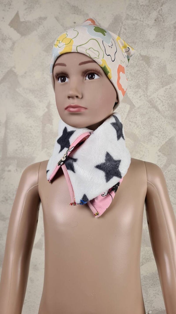 - Mini & Micky 2 : Upcycling - 1 Beige Jesey Druckknopf, die Enden sind 1x mit Koralle -Grau Melierte Jersey-Schrägstreifen Motiv gestreift und 1x Rosa Baumwollschrägstreifen Motiv Mini Maus versäubert, Außenseite Beige Baumwolle Motiv Micky Maus & Mini Maus, Innenseite Dunkelgrauer Fleece Motiv Weiße Sterne, ca. 47cm Lang und 25cm Breit