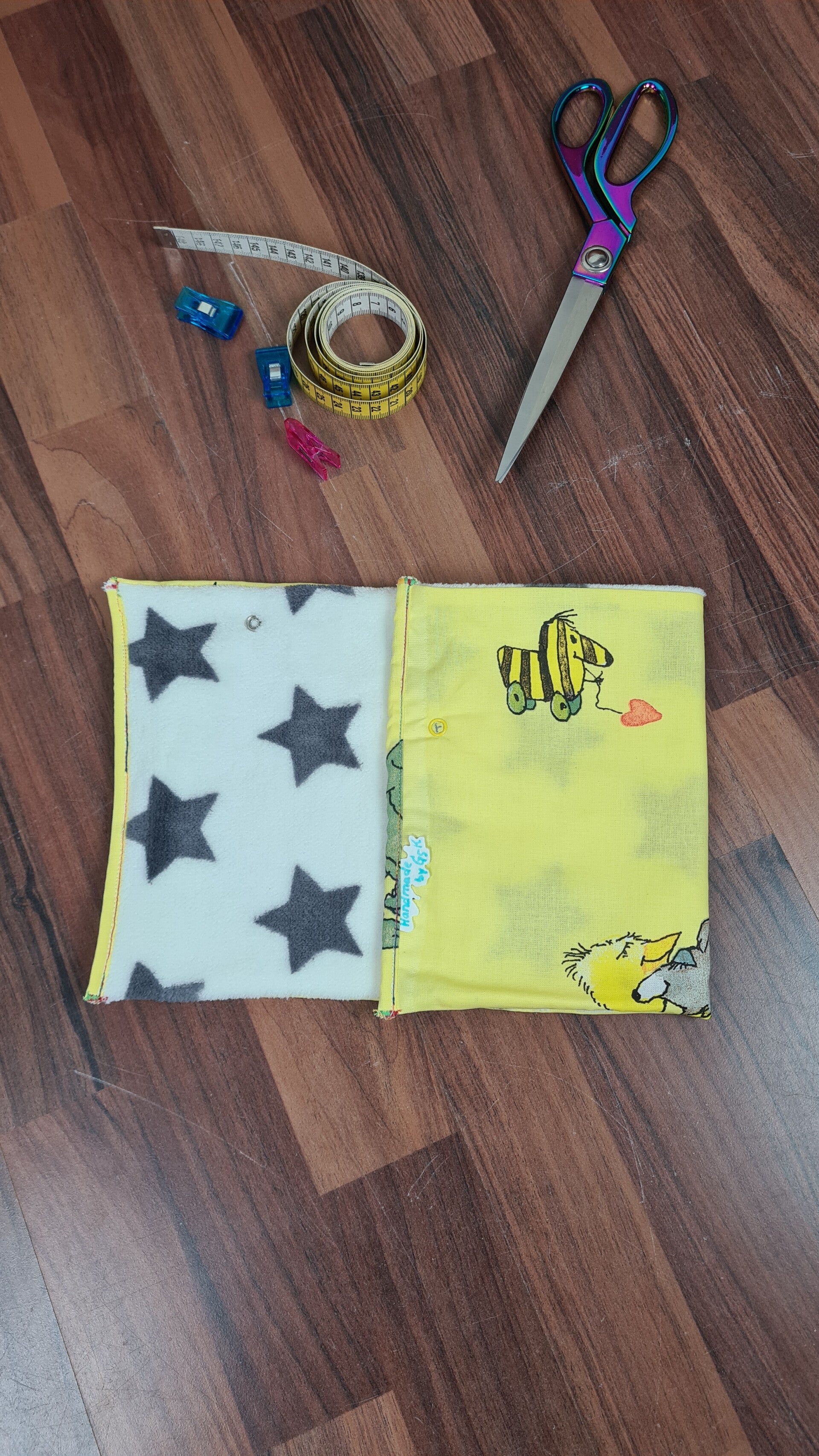 Materialien ich verarbeitet habe sind Baumwolle , Fleece und 1 bis 3 Druckknöpfe aus Metall Beschichtet