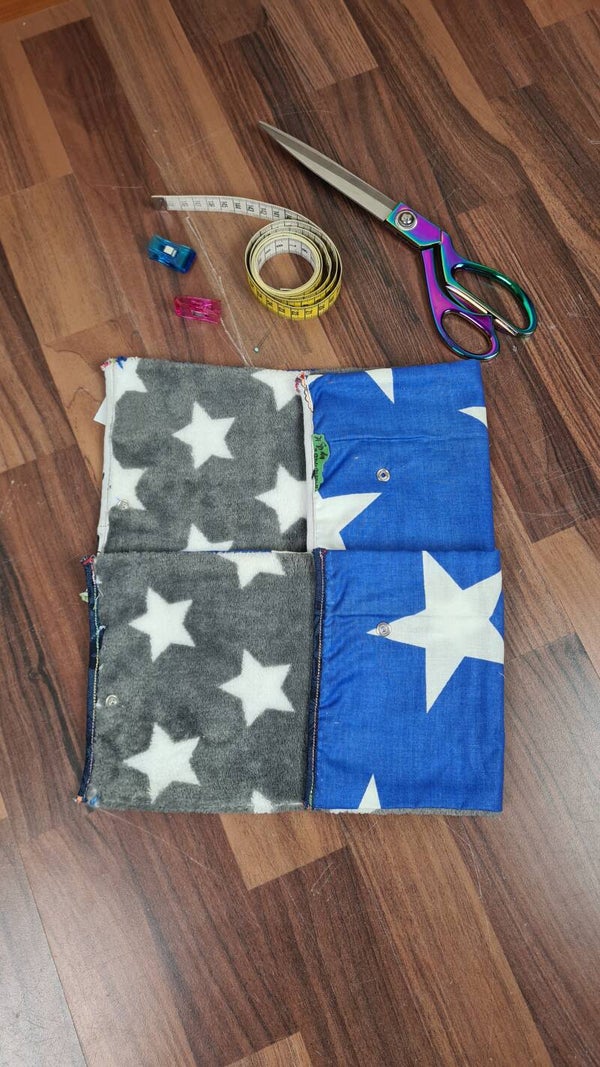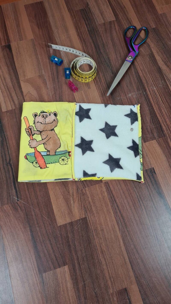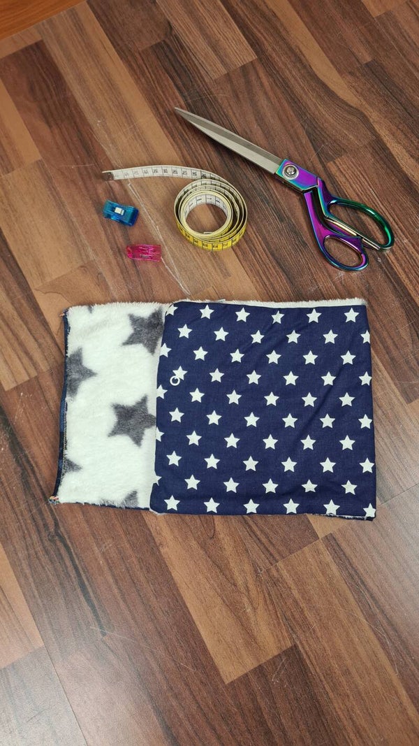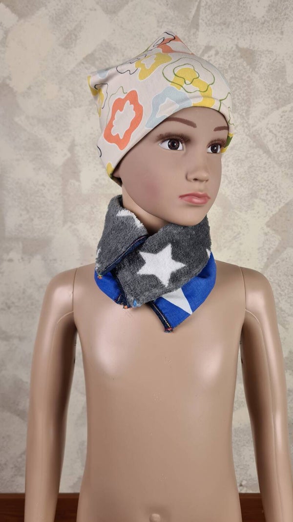 - Blau Stern 1 : 1 Dunkelblauer Jersey Druckknopf, die Enden sind mit Jeansblauen Jerseyschrägstreifen Motiv Blumen versäubert, Außenseite Blaue Baumwolle Motiv Große Weiße Sterne, Innenseite Grauer Fleece Motiv Große Weiße Sterne, ca. 40,50cm Lang und 16,50cm Breit