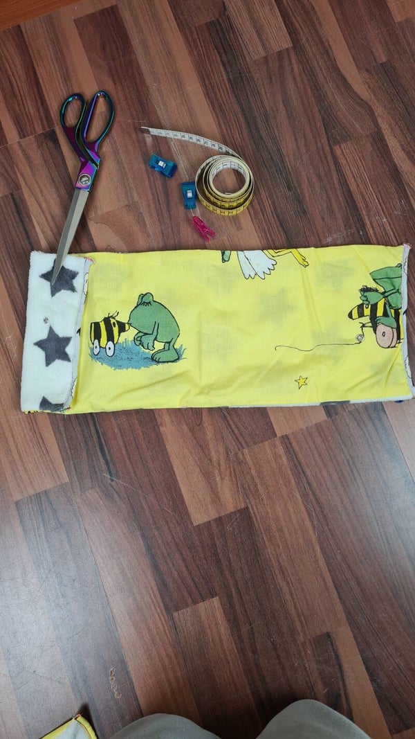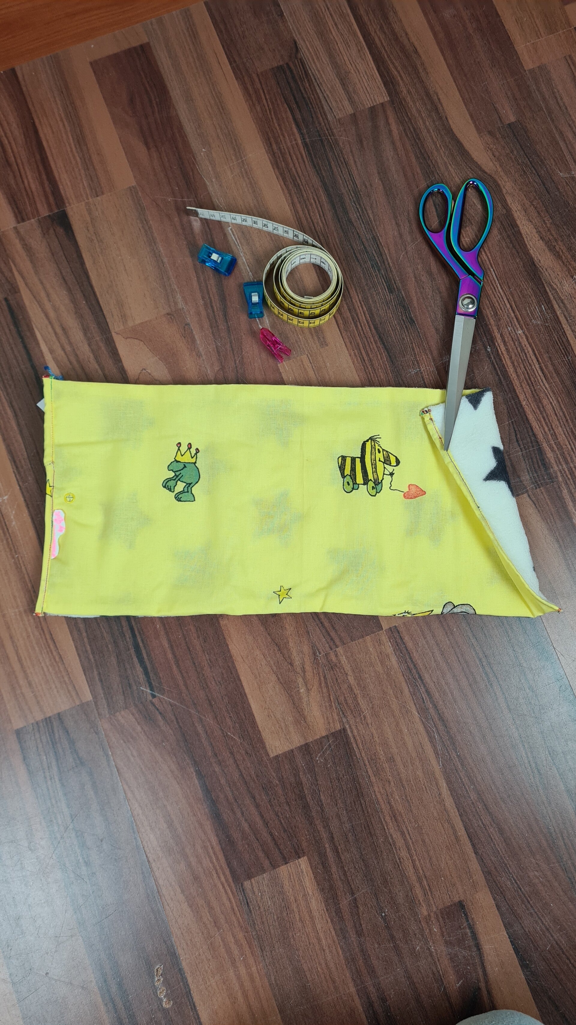 - Janosch 2 : Upcycling - 1 Gelber Jersey Druckknopf, die Enden sind aus Gelben Baumwollschrägstreifen Motiv Janosch versäubert, Außenseite Gelbe Baumwolle Motiv Janosch, Innenseite Weißer Fleece Motive Graue Sterne, ca. 46m Lang und 20,50cm Breit