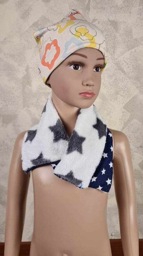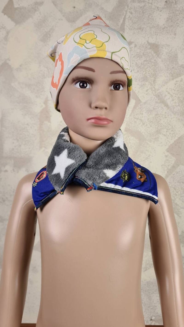 - Blau Stern 2 : 1 Hellblauer Jersey Druckknopf, die Enden sind mit Hellgrauen Jerseyschrägstreifen Motiv Scharfe versäubert, Außenseite Blaue Baumwolle Motiv Große Weiße Sterne, Innenseite Grauer Fleece Motiv Große Weiße Sterne, ca. 41cm Lang und 17cm Breit