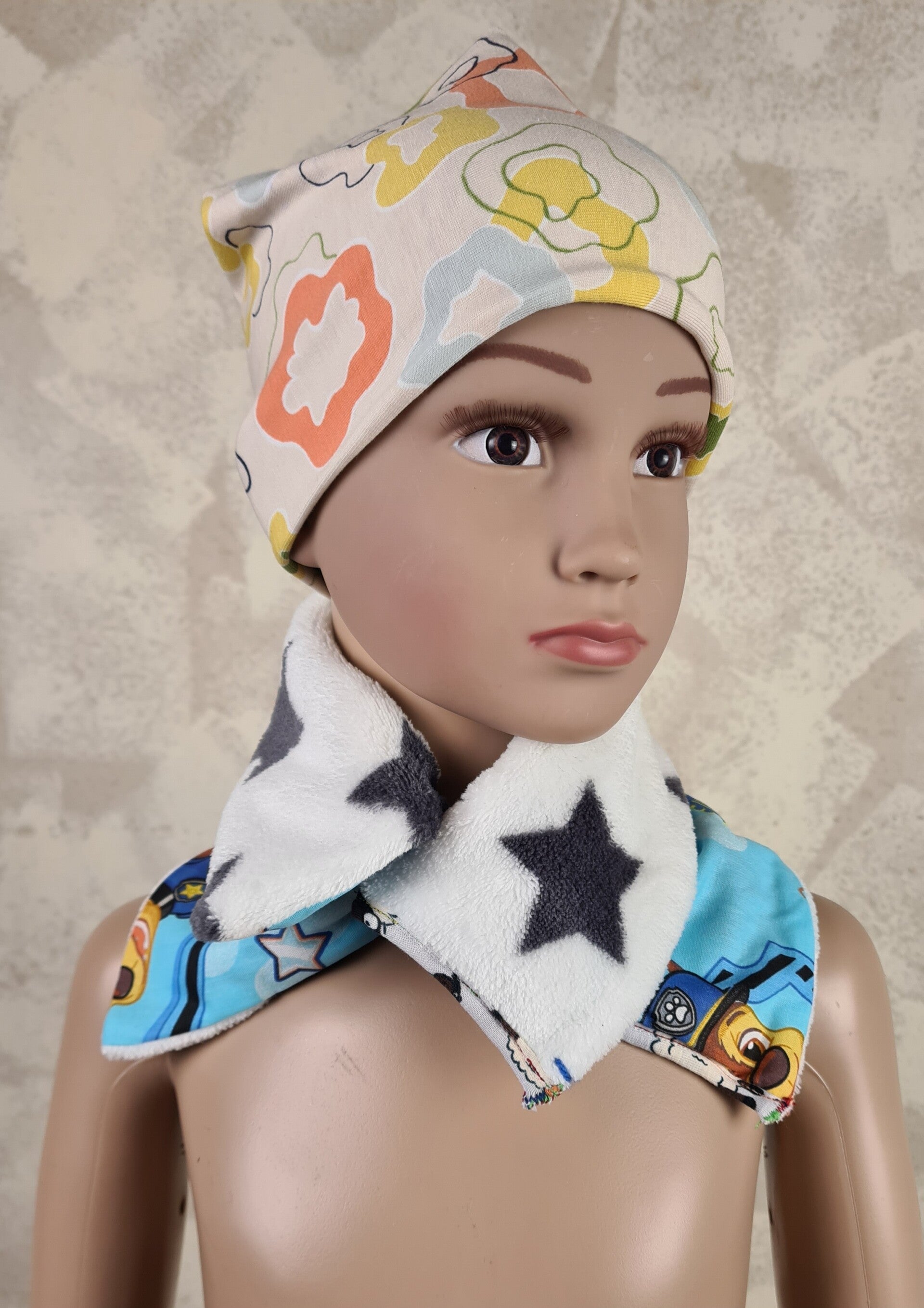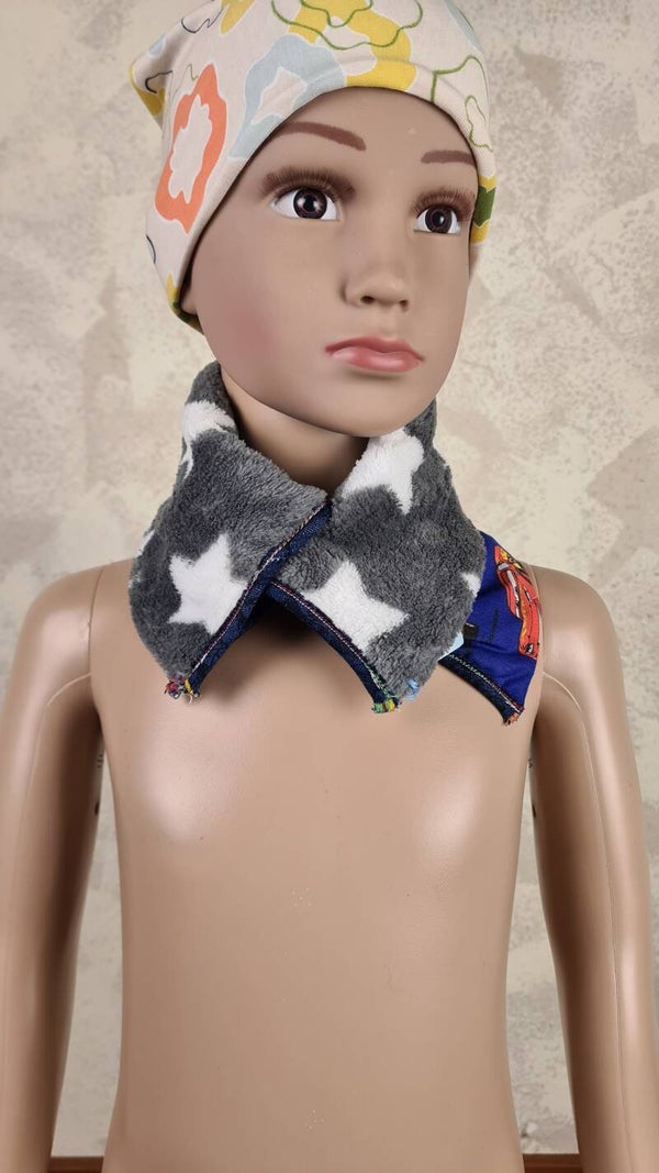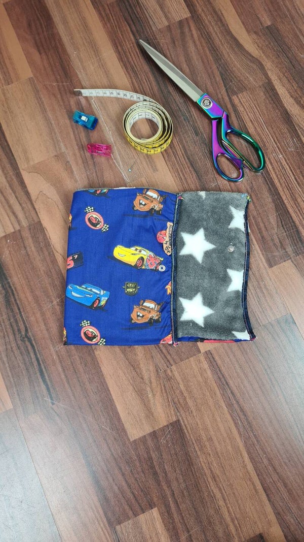 - Cars 1 : Upcycling - 1 Dunkelblauer Jersey Druckknopf, die Enden sind mit Jeansblauen Jerseyschrägstreifen Motiv Blumen versäubert, Außenseite Dunkelblaue Baumwolle Motiv Cars, Innenseite Dunkelgrauer Fleece Motiv Weiße Sterne, ca. 40,50cm Lang und 20cm Breit