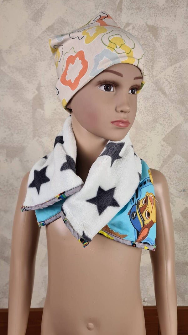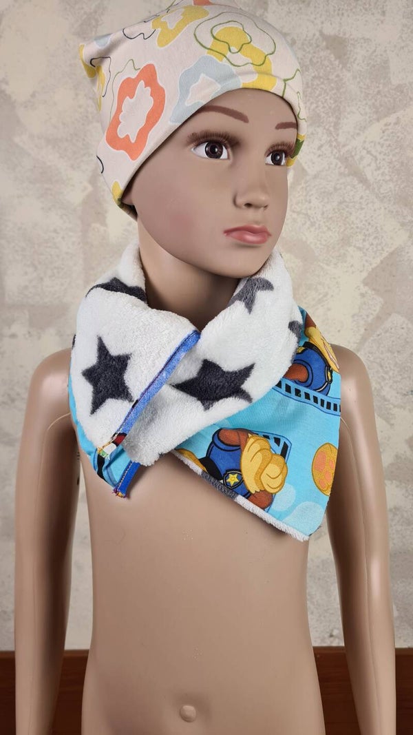 - Paw Patrol 1 : Upcycling 1 Hellblauer Jersey Druckknöpf, die Enden sind mit Grauen Baumwollschrägstreifen Motiv Rennauto versäubert worden, ca. 51,50cm Lang und 24cm Breit, Außenseite Hellblaue Baumwolle Motiv Paw Patrol, Innenseite Weißes Fleece Motiv Graue Sterne