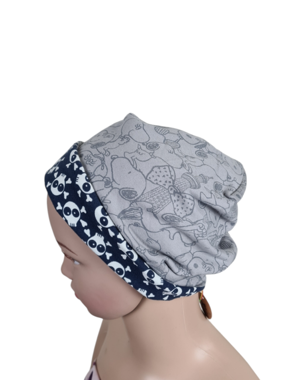 - *Upcycling* Grauer Jersey Motiv Snoopy + Dunkelblauer Jersey Motiv Weißer Totenkopf - KU 47cm ab 9 Monate und 25,50cm Höhe