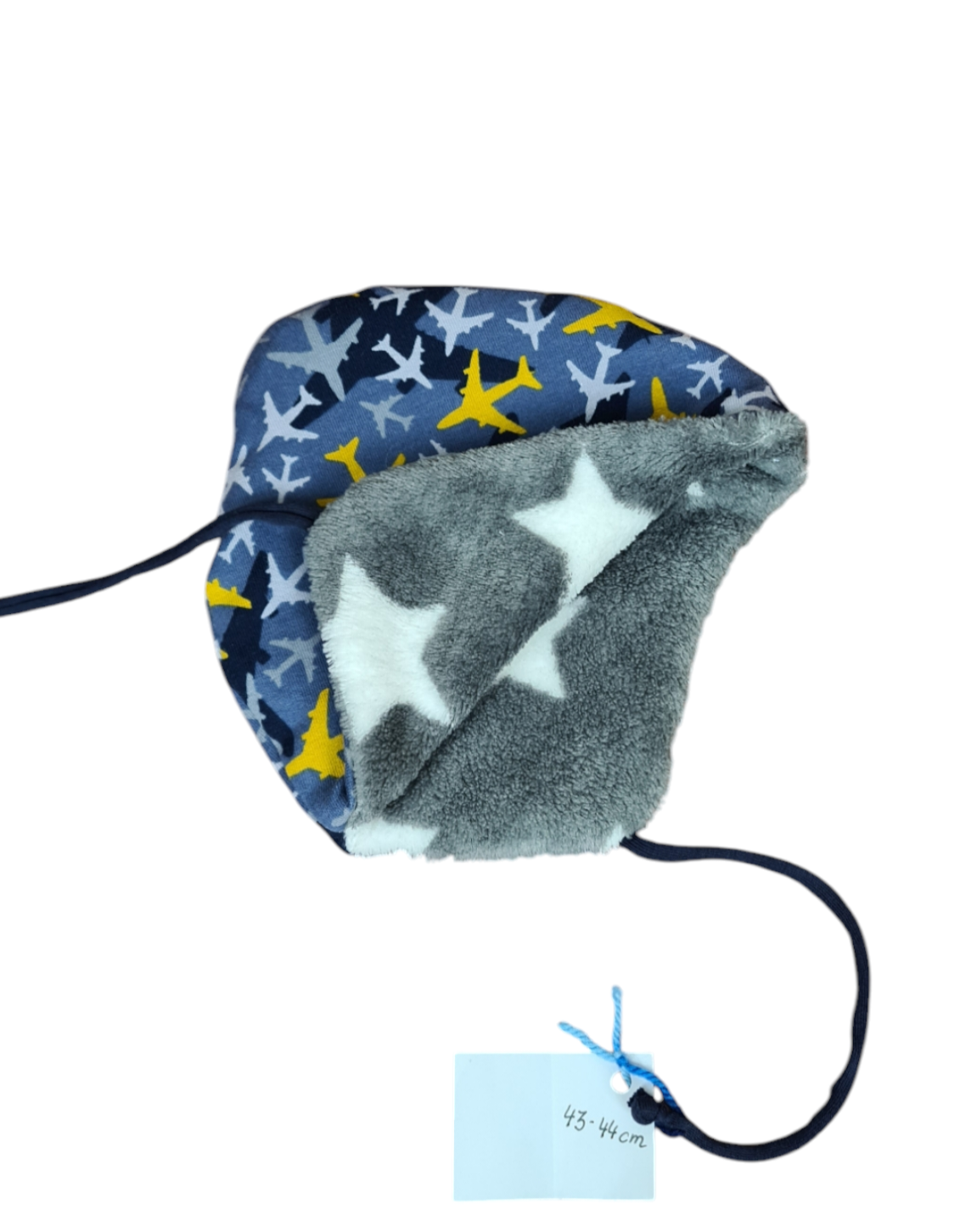 - VA 4 : Graublauer Jersey Motiv Gelb und Graue Flugzeuge + Grauer Fleece Motiv große Weiße Sterne, Dunkelblaue Jersey Schrägband ca. 18cm Lang, KU 43-44cm