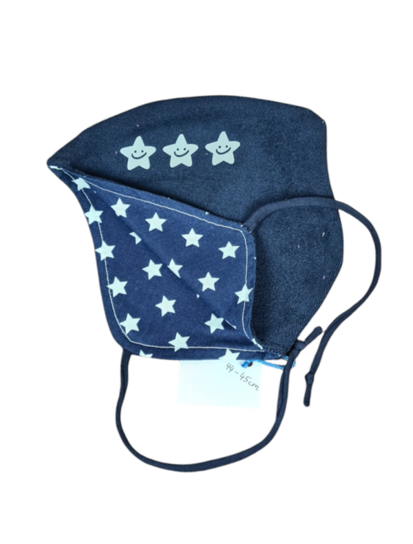 - VA 10 : Dunkelblauer Fleece Motiv Uni und 3 pro Seite Smiley Sterne als Reflektoren + Dunkelblauer Baumwolle Motiv kleine Weiße Sterne, Dunkelblauer Jersey Schrägband ca. 25cm Lang, KU 44-45cm