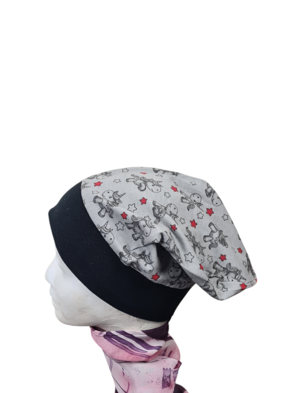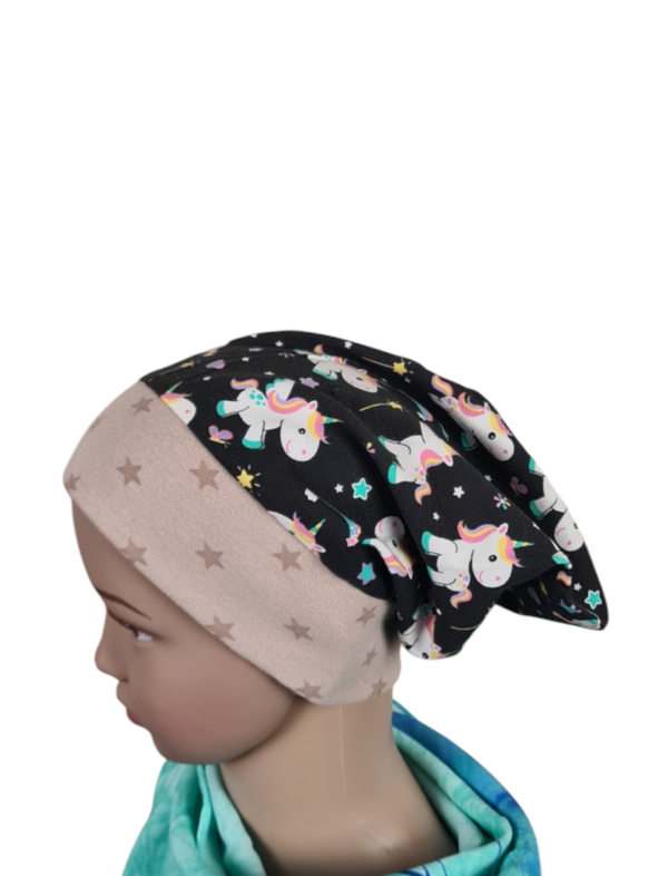 - Mo 2 : Schwarzer Jersey Motiv buntes Einhörner, Beiges Bündchen Motiv Beige Sterne ca. 5cm Breit ,Beanie gesasmt ca. 27,50cm Hoch