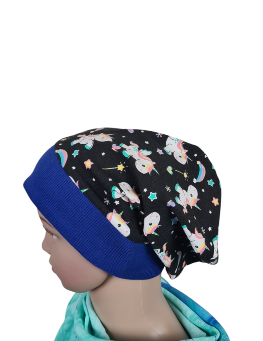 - Mo 3 : Schwarzer Jersey Motiv bunte Einhörner, Roayl Bündchen Motiv Uni ca. 5cm Breit, Beanie gesamt ca. 27,50cm Hoch