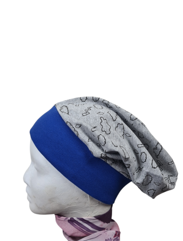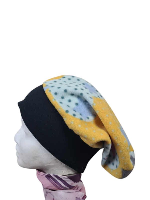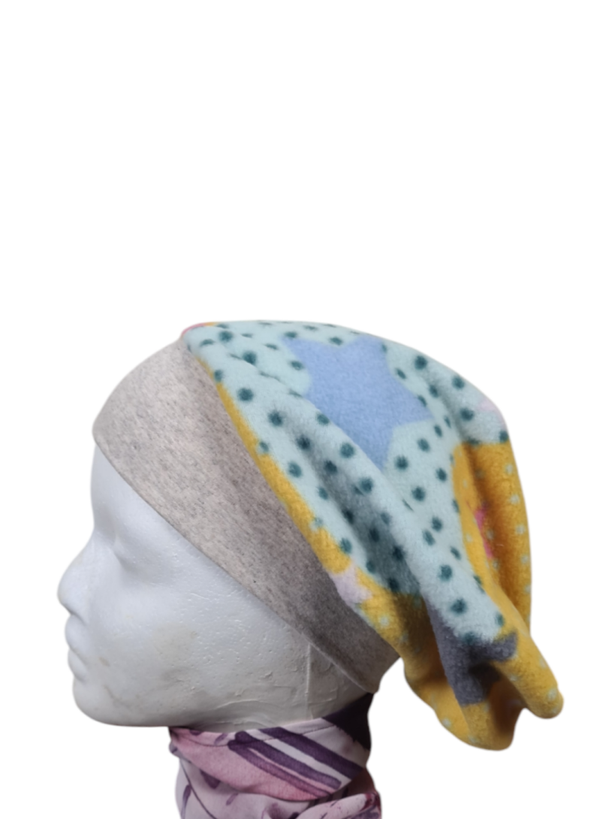 - Mo 4 : Gelber Fleece Motiv Sterne auf Herzen, Grauer French Terry** Motiv Gewitter als Bündchen ca. 3cm Breit, Beanie gesamt ca. 30cm Hoch