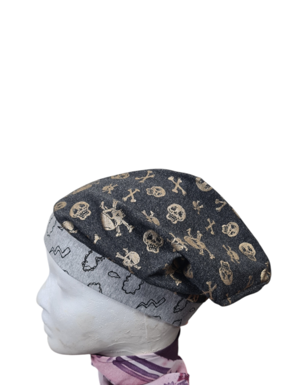 - Mo 8 : Dunkelgrauer French Terry** Motiv Goldene Totenköpfe, Grauer French Terry** Motiv Gewitter als Bündchen ca. 3,50cm Breit, gesamt ca, 30,50cm Hoch