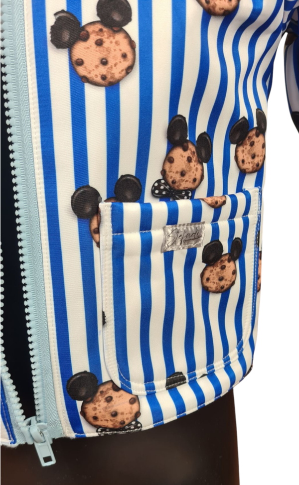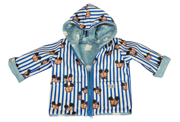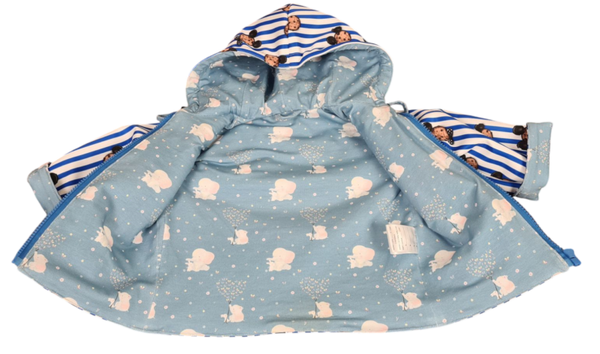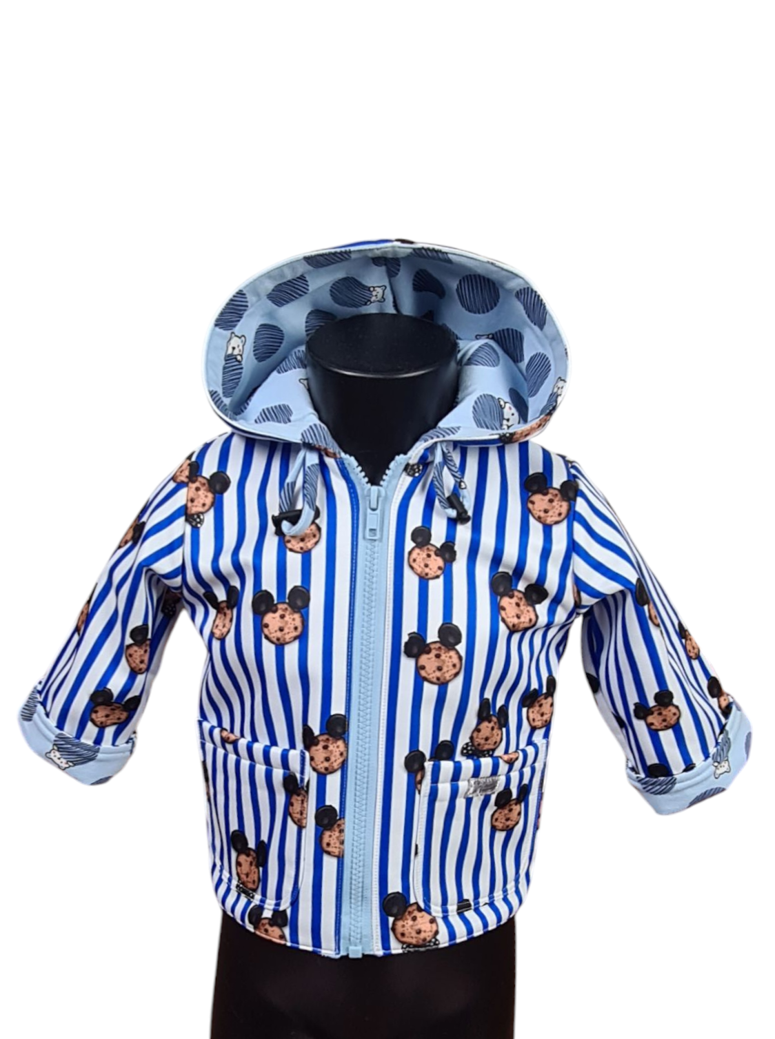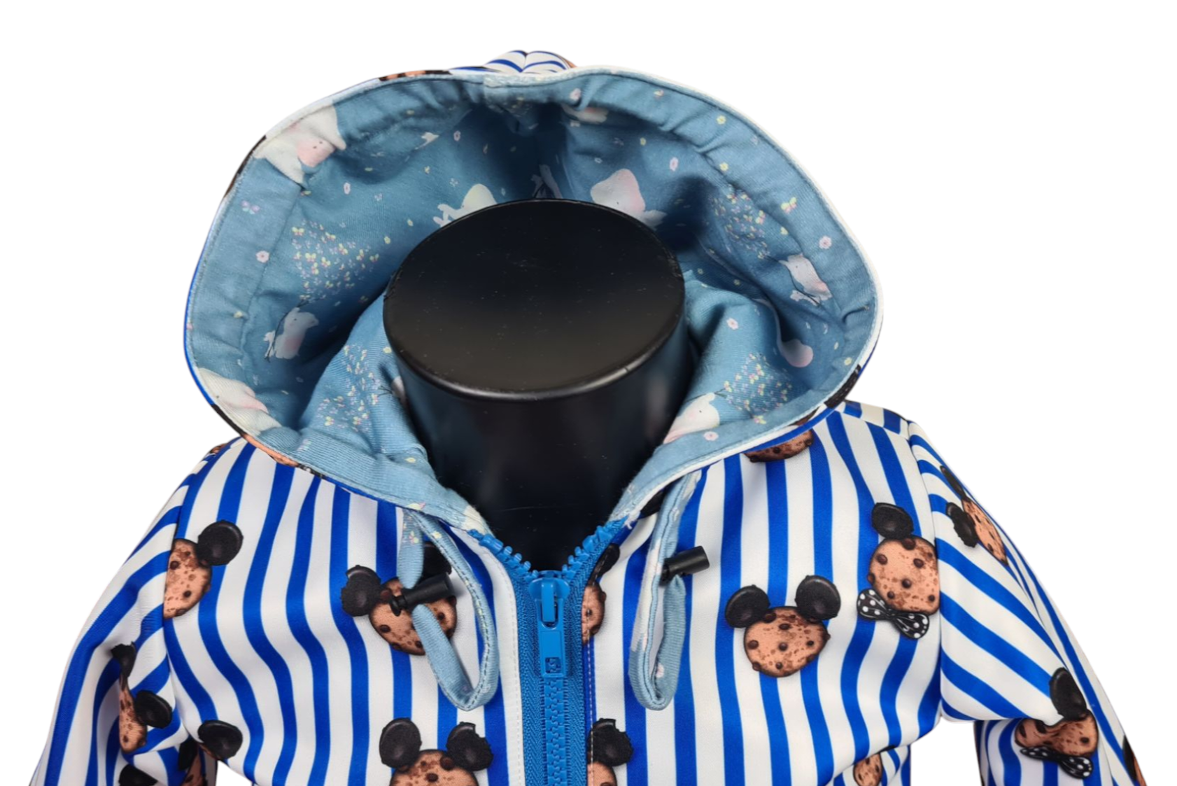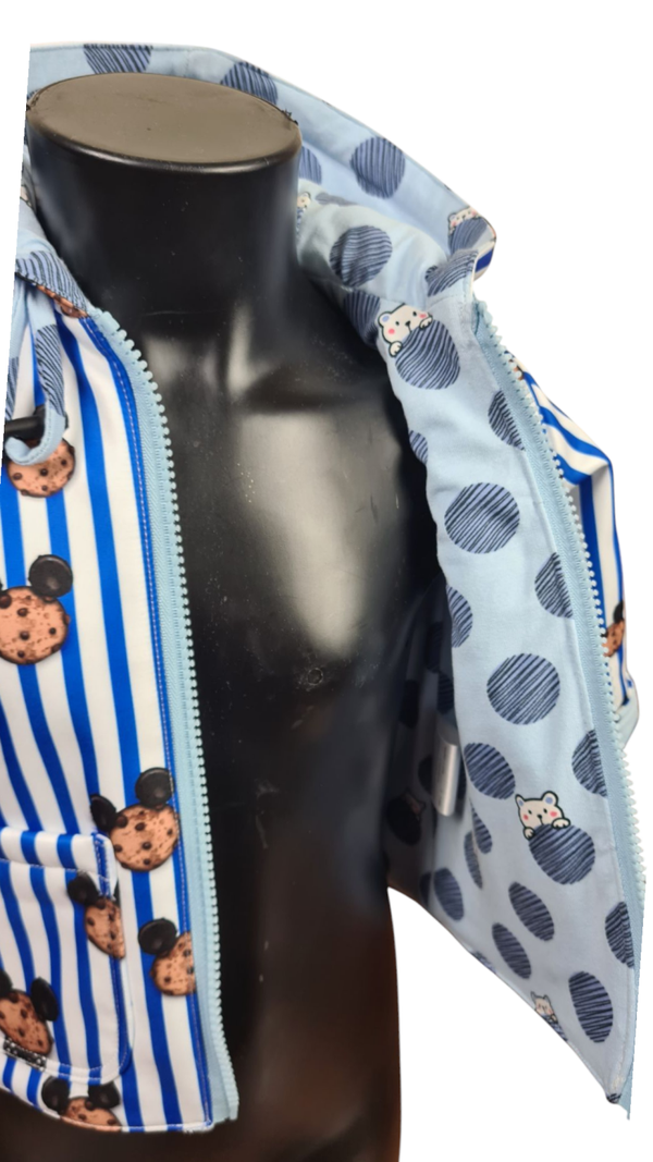 Die Jacke hat 2 aufgesetzte Taschen Vorne , einen 30cm langen Reißverschluss und eine großzügige Mütze mit Jersey Zugband ( gleiche Stoff wie Futter ) mit Stopper. Das Zugband der Mütze ist in der Mittelnaht der Mütze festgesteppt und die Enden jefalls in der der Nahtzugaben festgenäht.