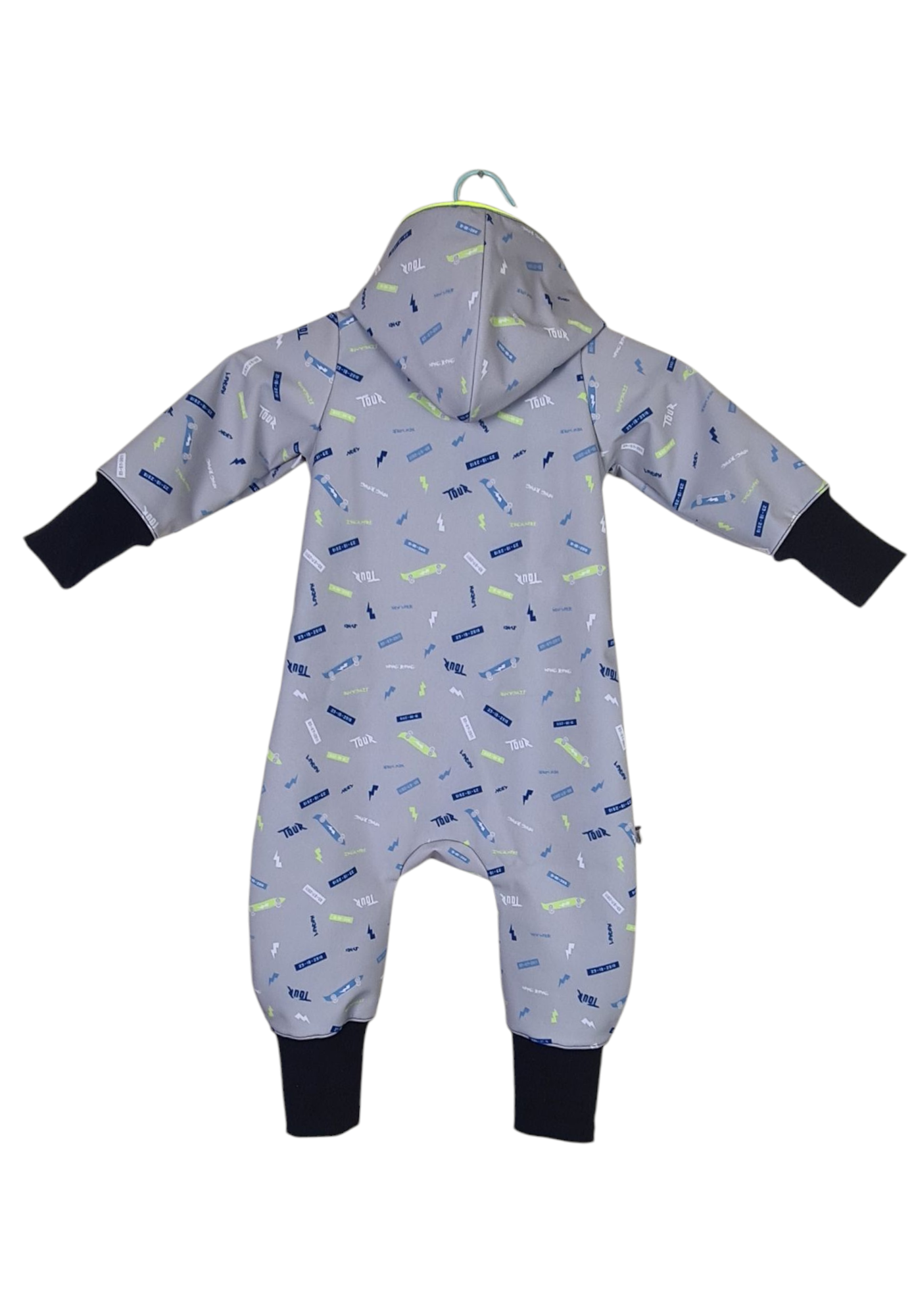 - Softshell-Anzug 92 - 98 , Farbe : Grau , Motiv : Tour , Mütze in Dunkelblau mit weiße Sterne abgefüttert