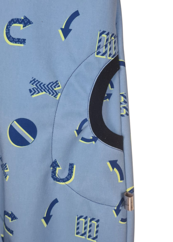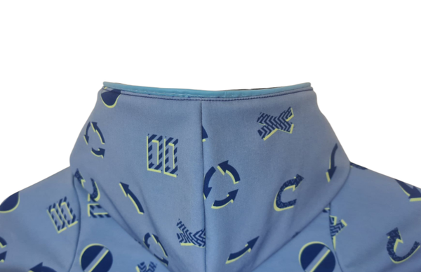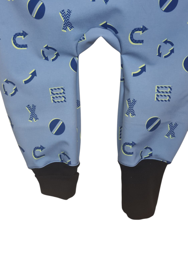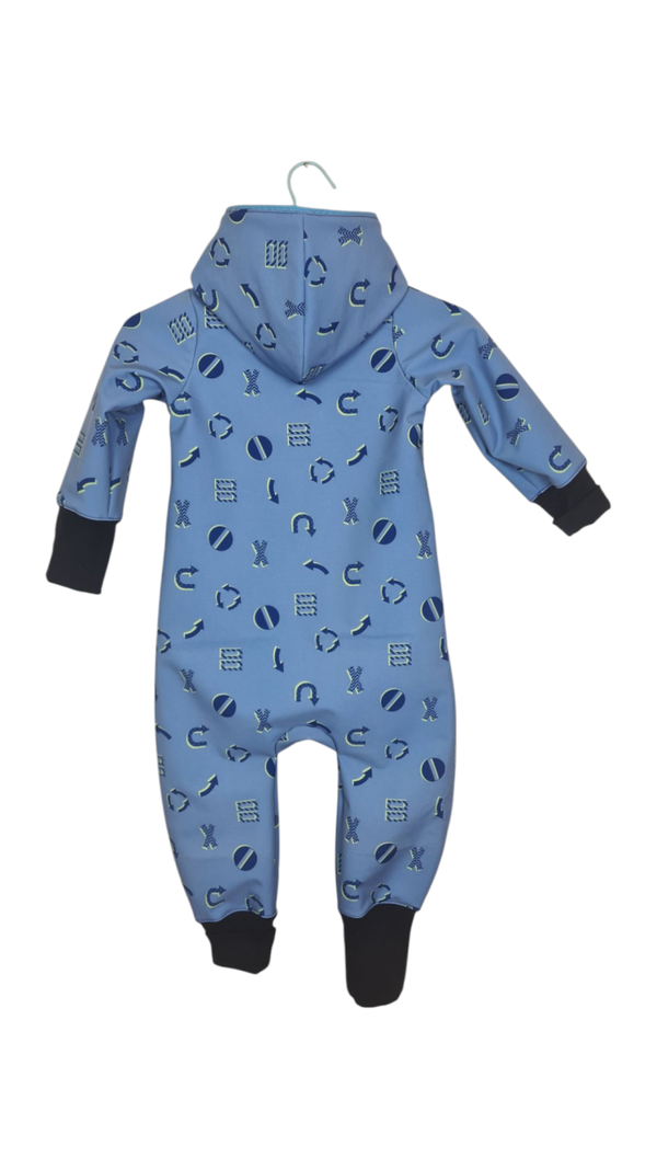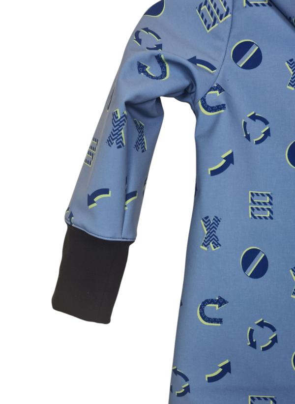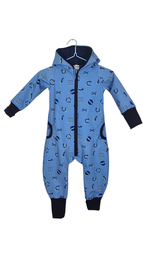 - Softshell-Anzug 104 - 110 , Farbe : Blau , Motiv : Zeichen , Mütze in Uni Blau abgefüttert