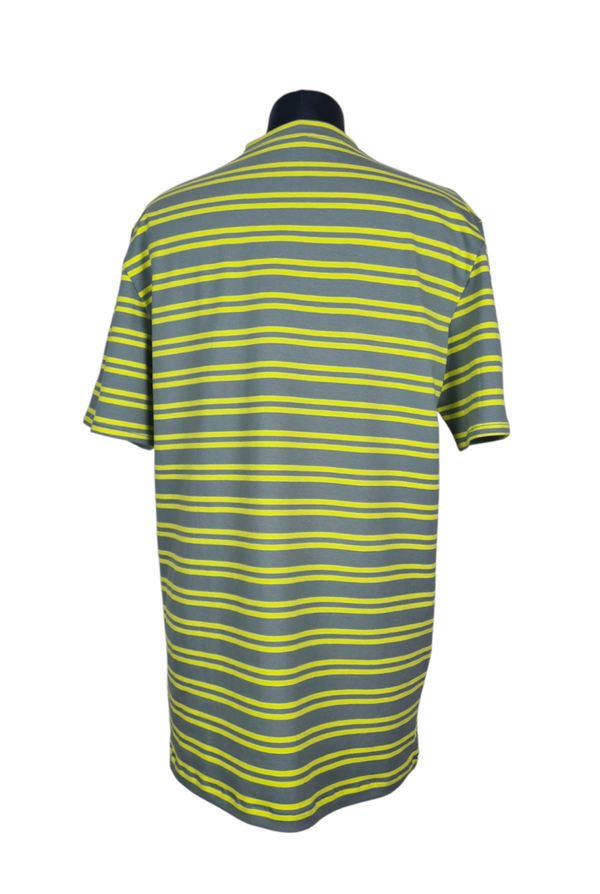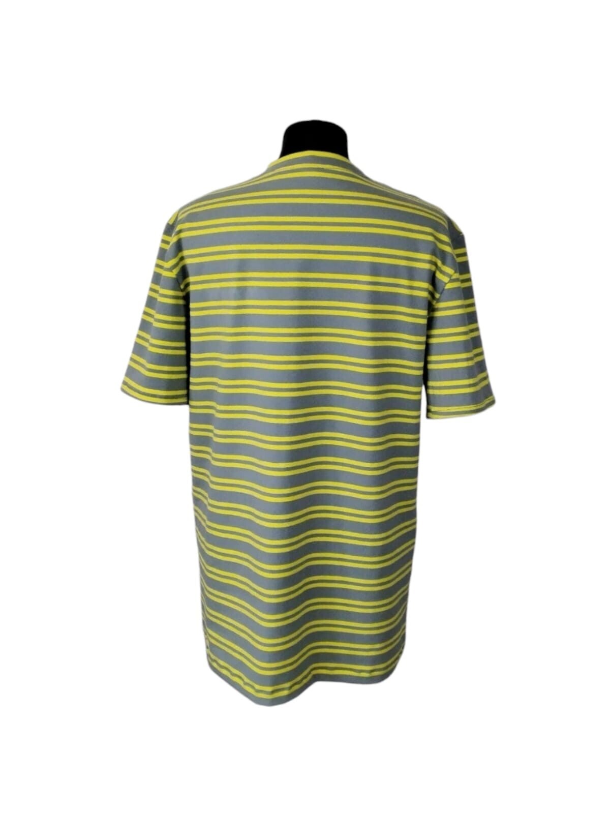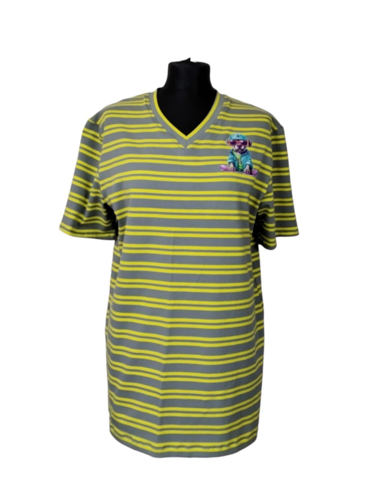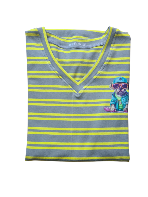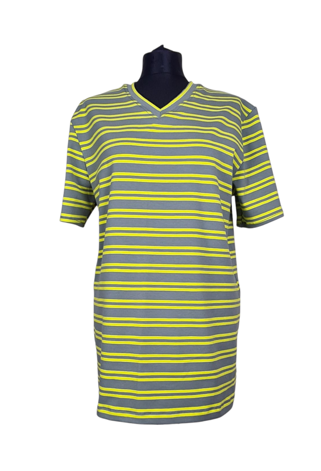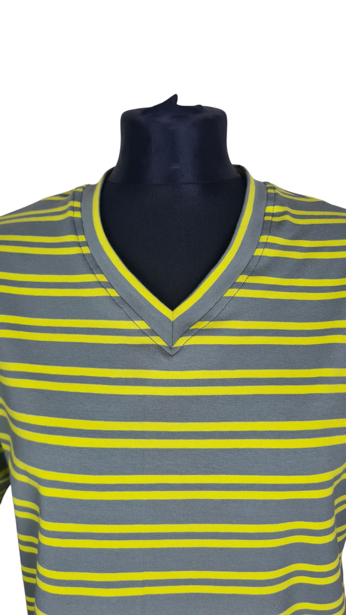 Hier habe ich ein Baumwolljersey in Grau-Lemon gestreift mit einem V-Ausschnitt genäht.