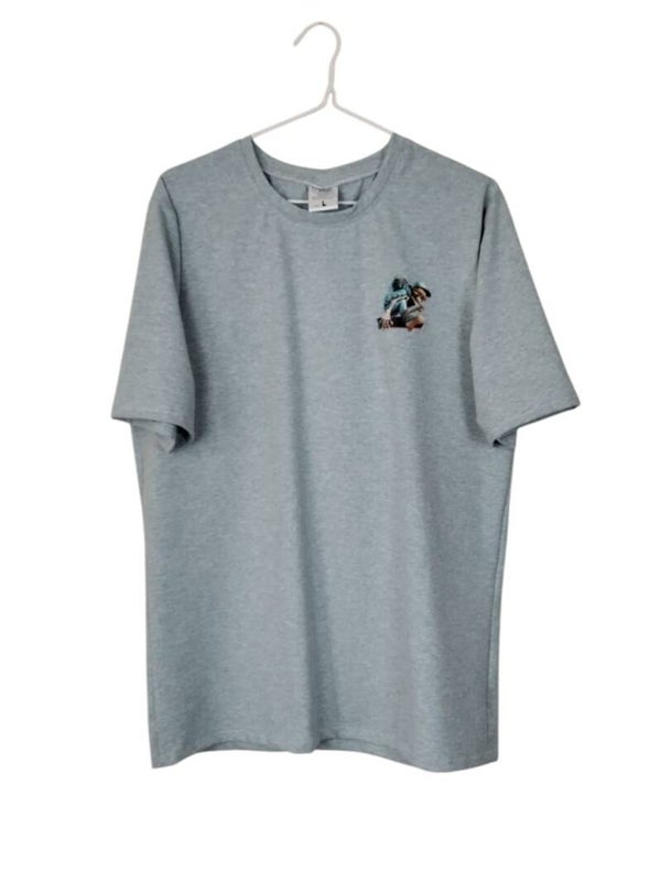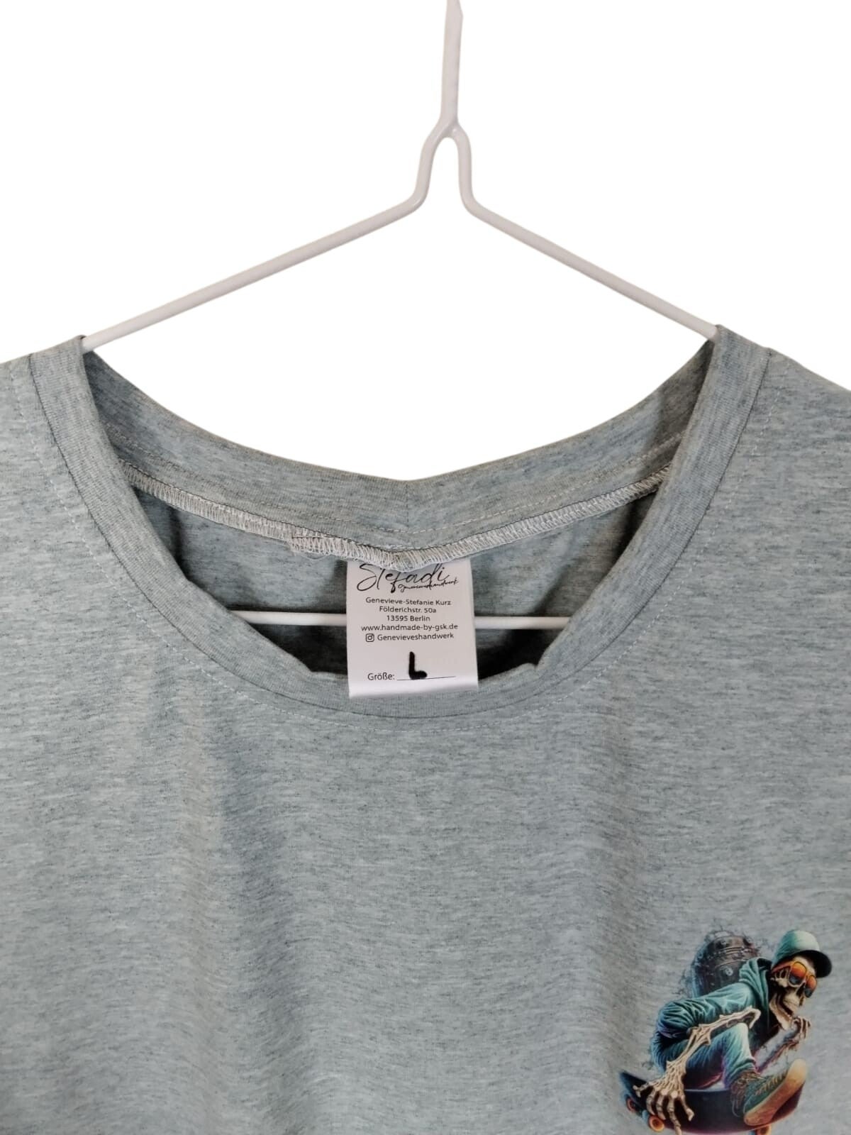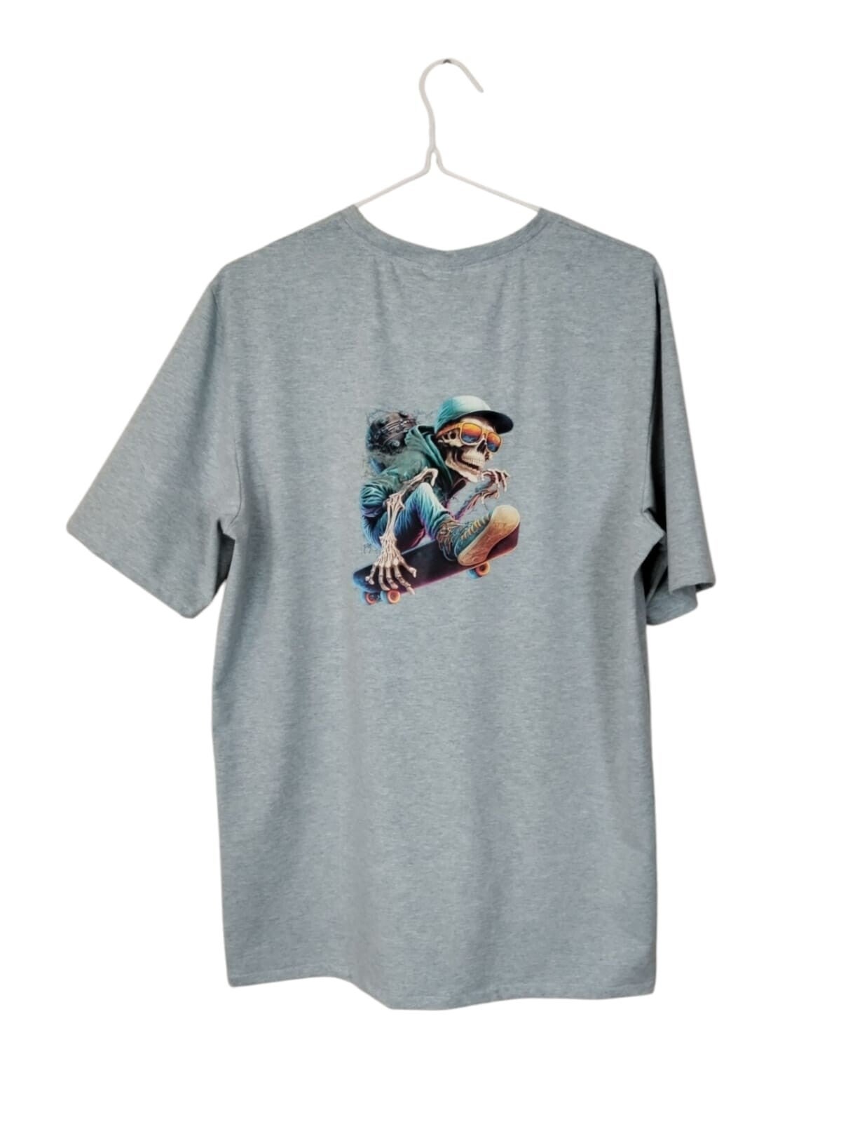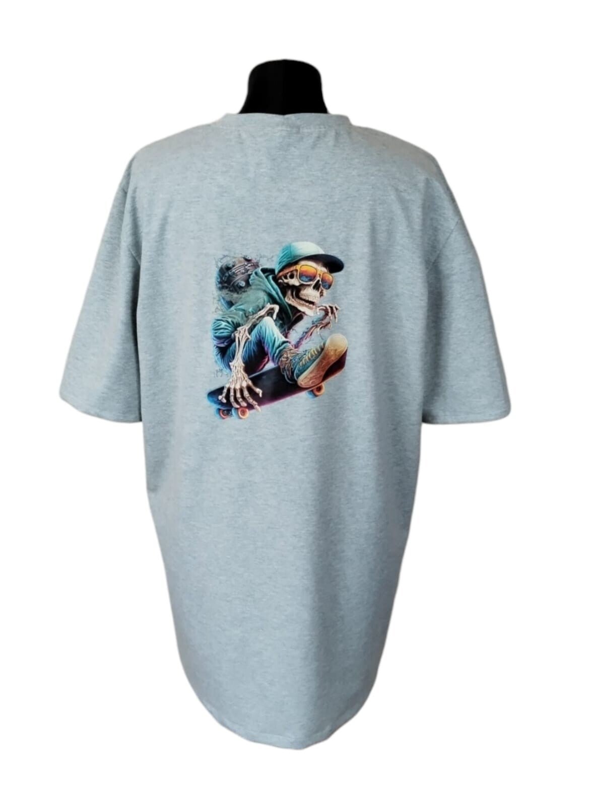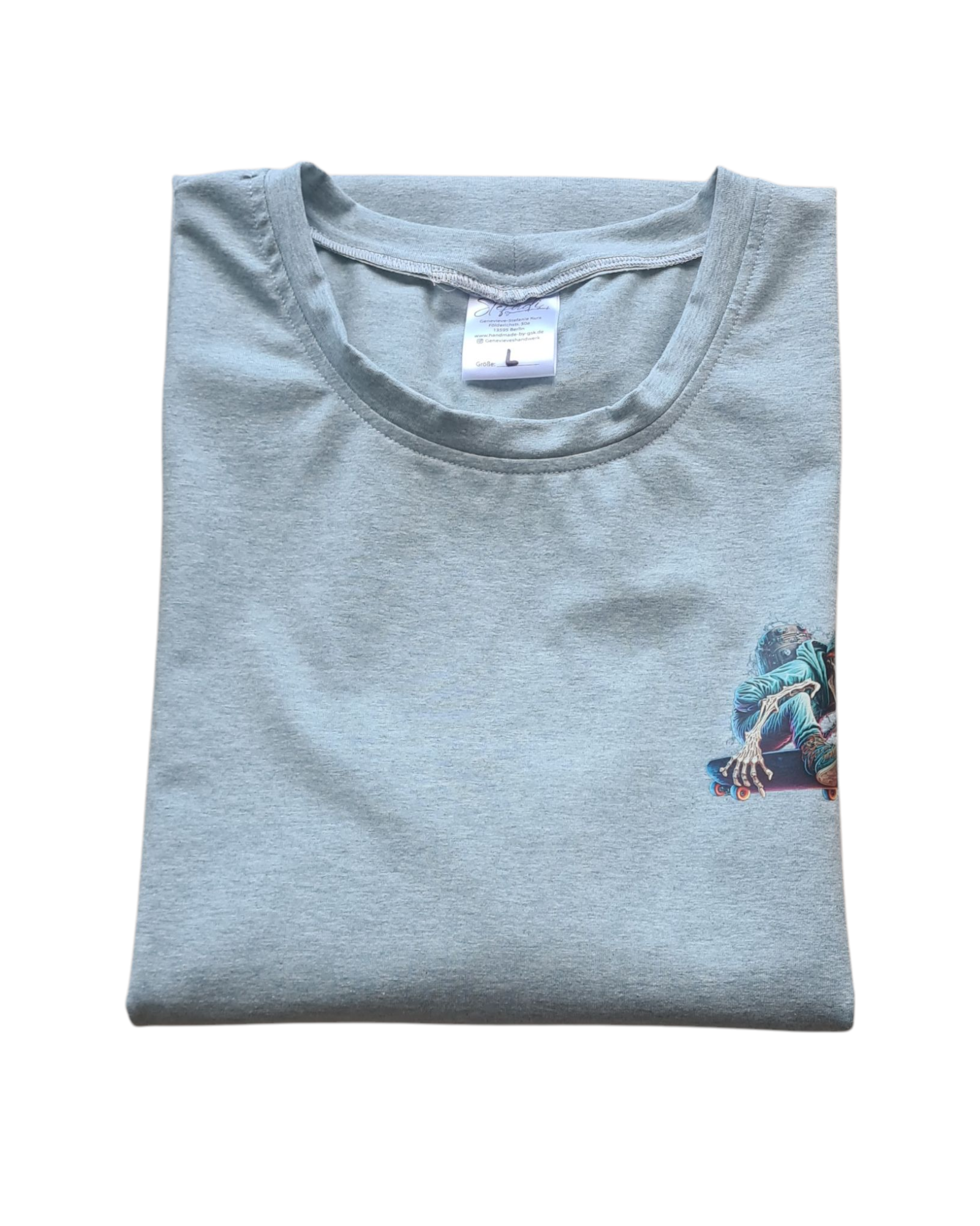 Herren T-Shirt aus Baumwolljersey in Mint Meliert mit einem Kleinen Bügelbild vorne und einem Großen Bild hinten,Motiv eines HipHop - Skelett auf nem Skateboard gearbeitet - genäht.