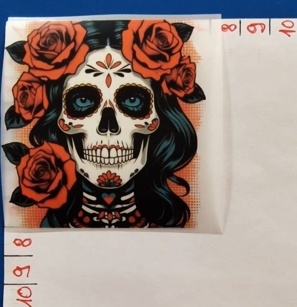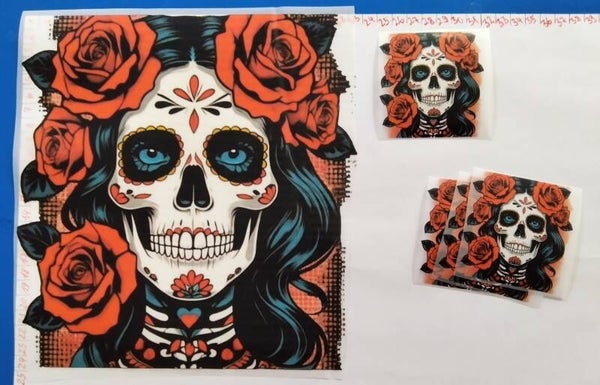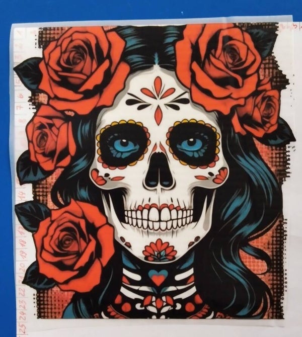 Bügelbilder verschiedene Größen * Los Muertos Frauenkopf + Roterosen