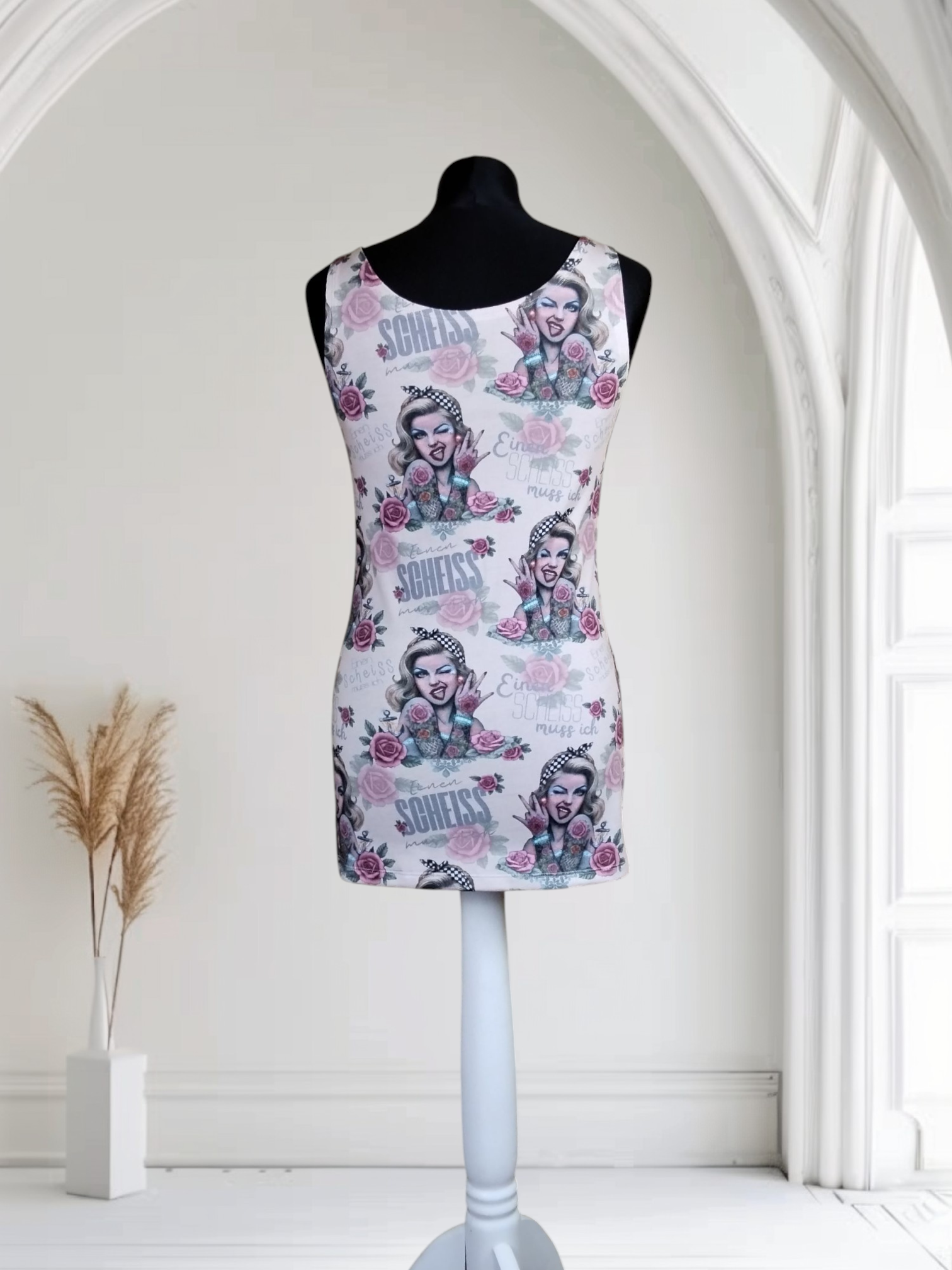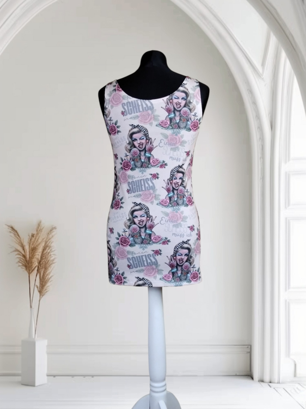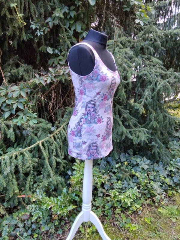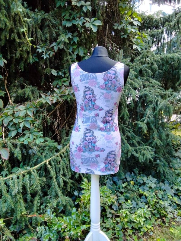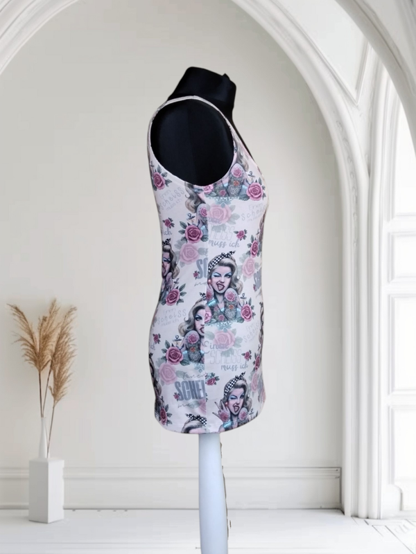 Das Tanktop ist Figurbetont und ein wenig länger als im Handelsüblichen gebrauch.Hals und Ärmel wurden mit einer Blende versäubert und abgesteppt. Die Träger haben eine breite von ca. 2cm breit