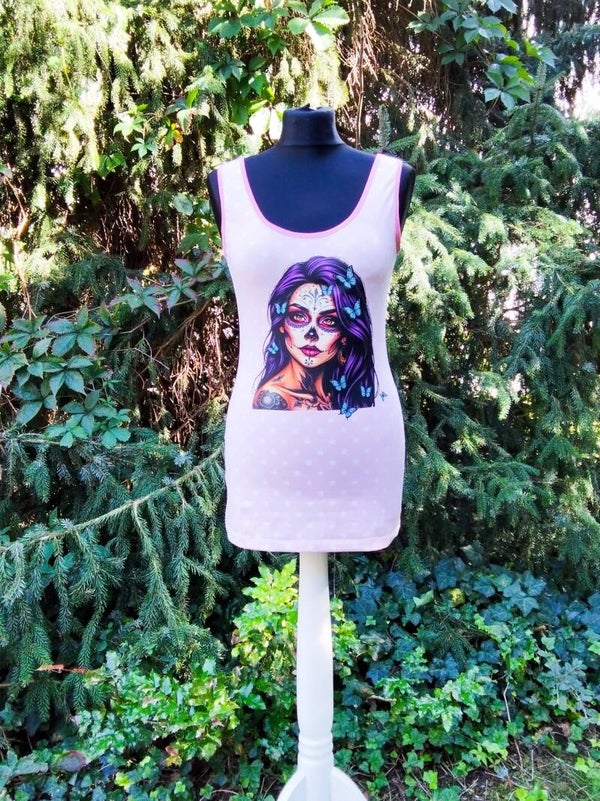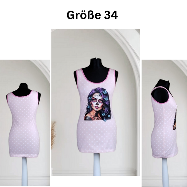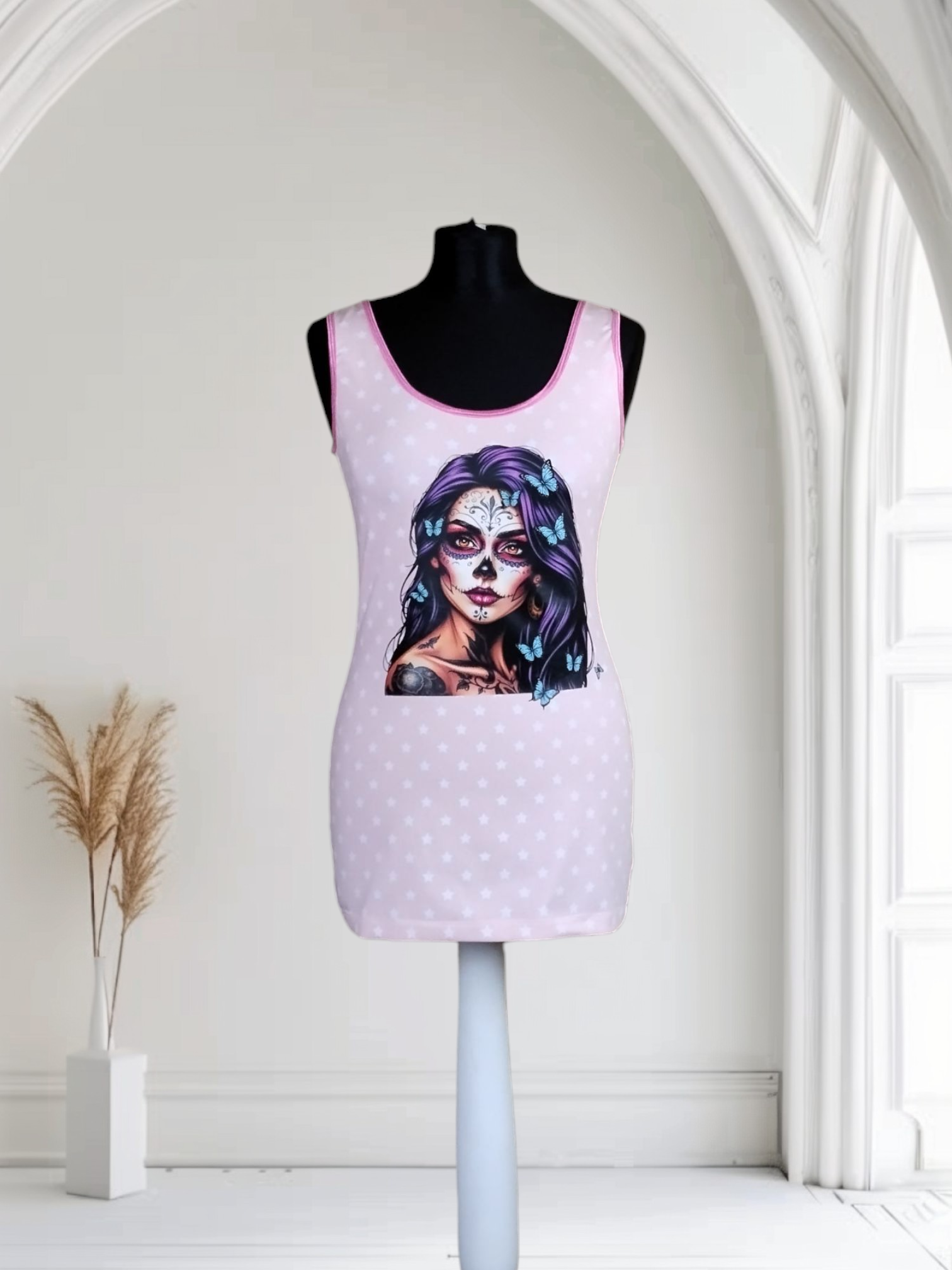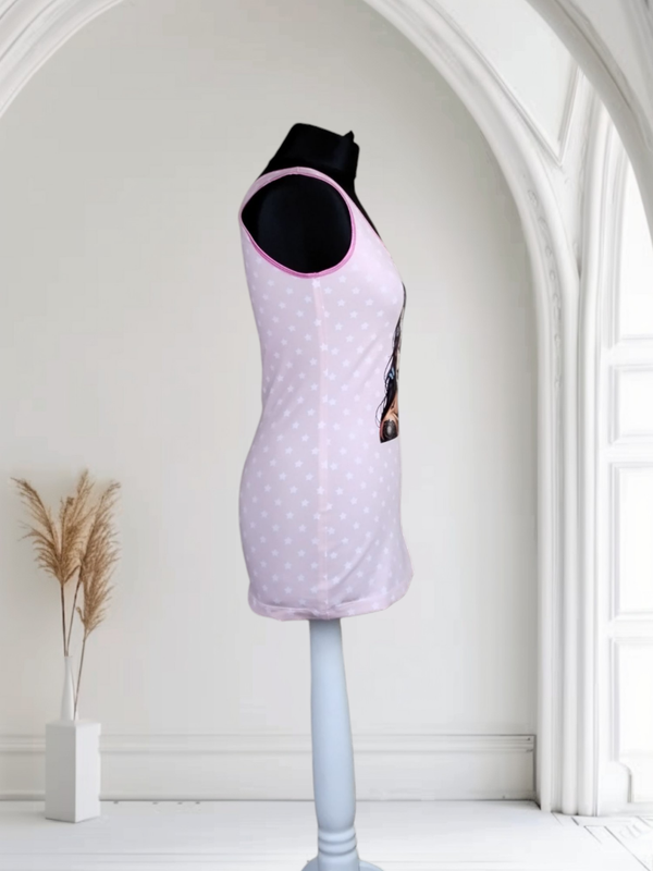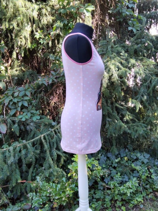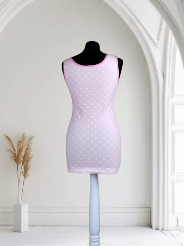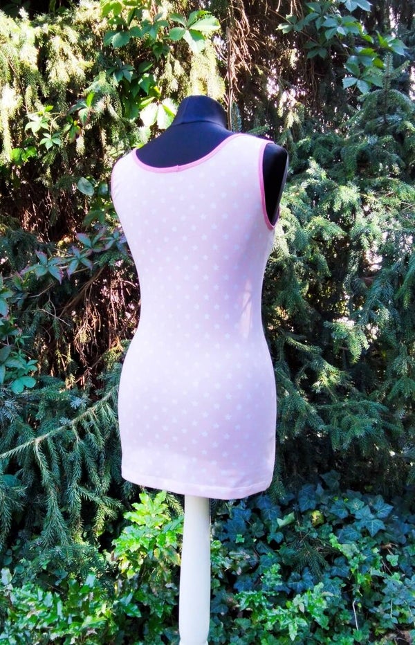 Hier habe ich ein Rosa Baumwollejersey mit weißen Sternen vernäht zum Tanktop.Vorne mittig habe ich ein Bügelbild aufgebügelt .